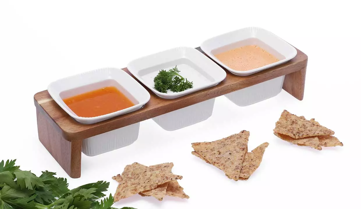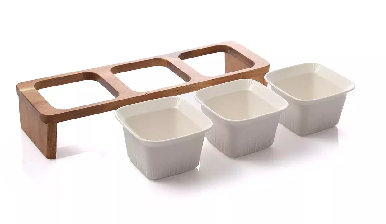 Tamaño | Tazones: 10 cm de diámetro x 6 de alto / Base: 9 cm de ancho x 30 cm de largo |