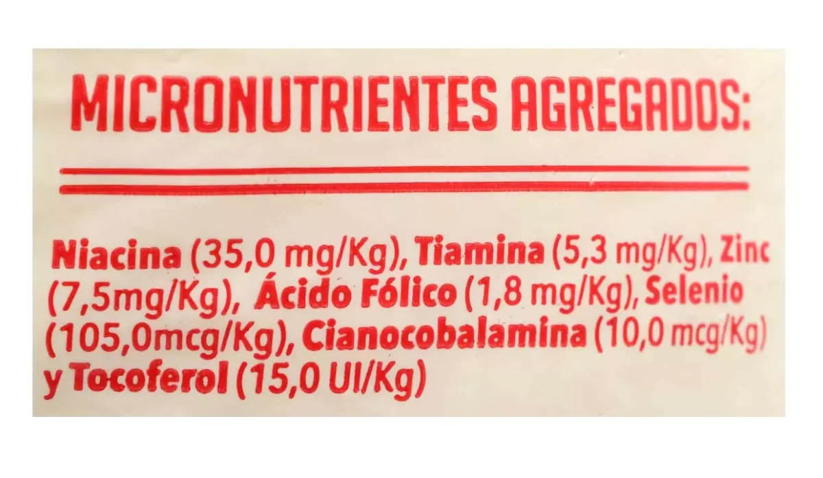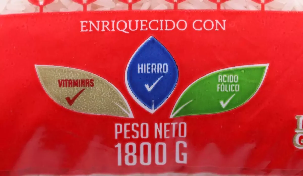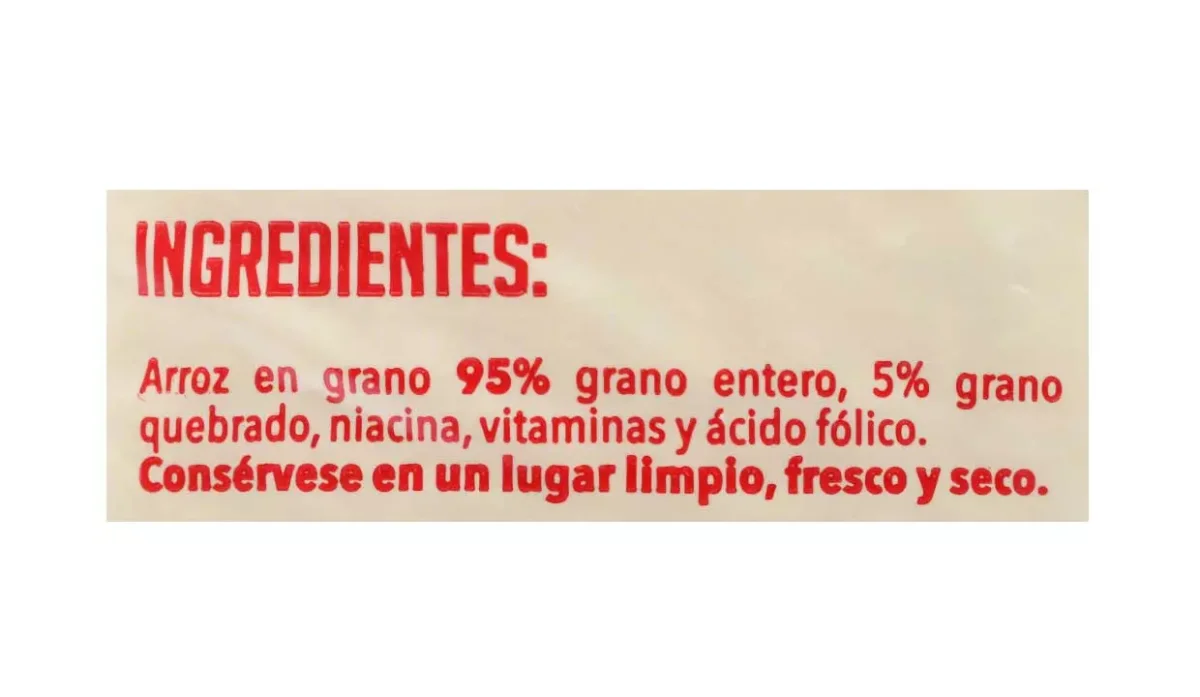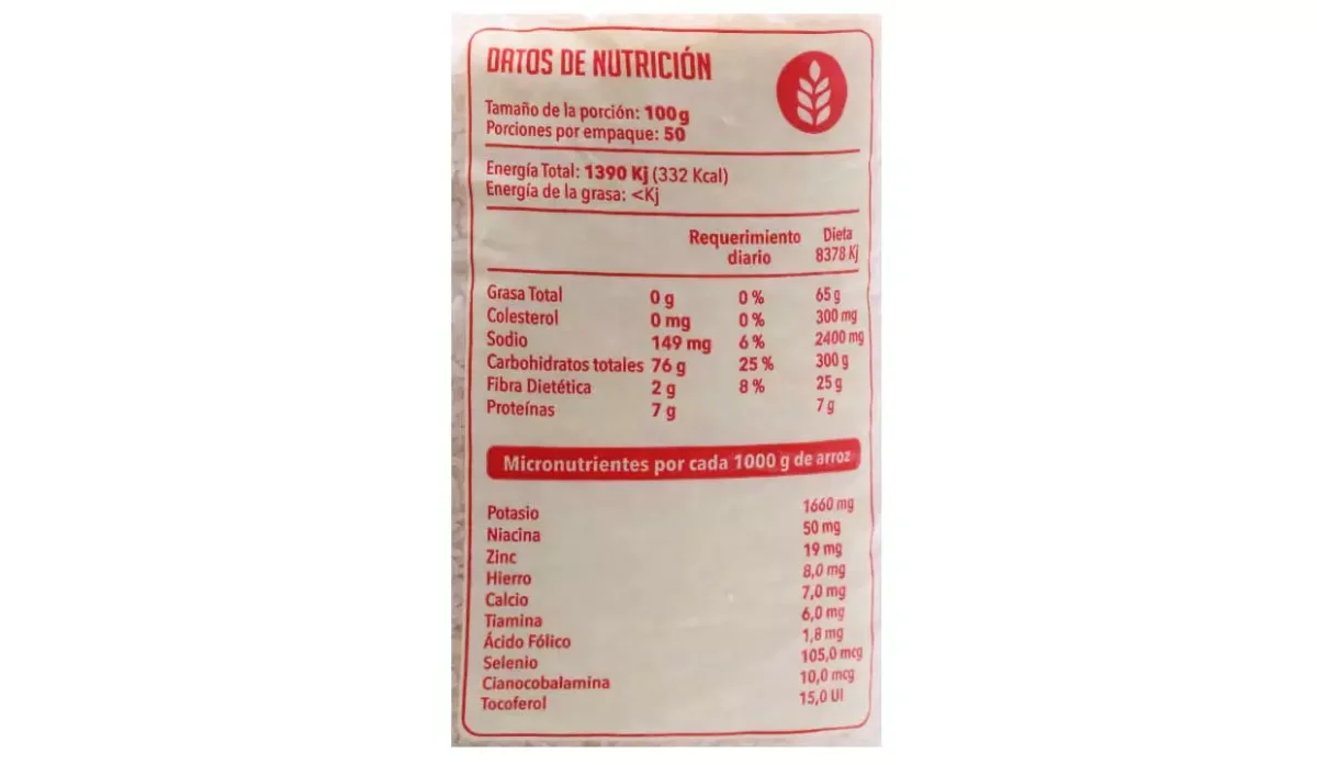 | Características | Arroz 95% grano entero enriquecido con Vitaminas, Hierro y Ácido Fólico |