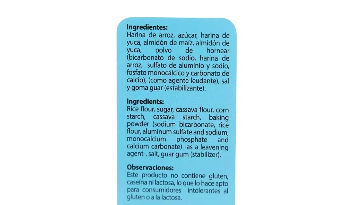 | Ingredientes | Harina de arroz, azúcar, harina de yuca, polvo de hornear, almidón de maíz, almidón de yuca y sal |