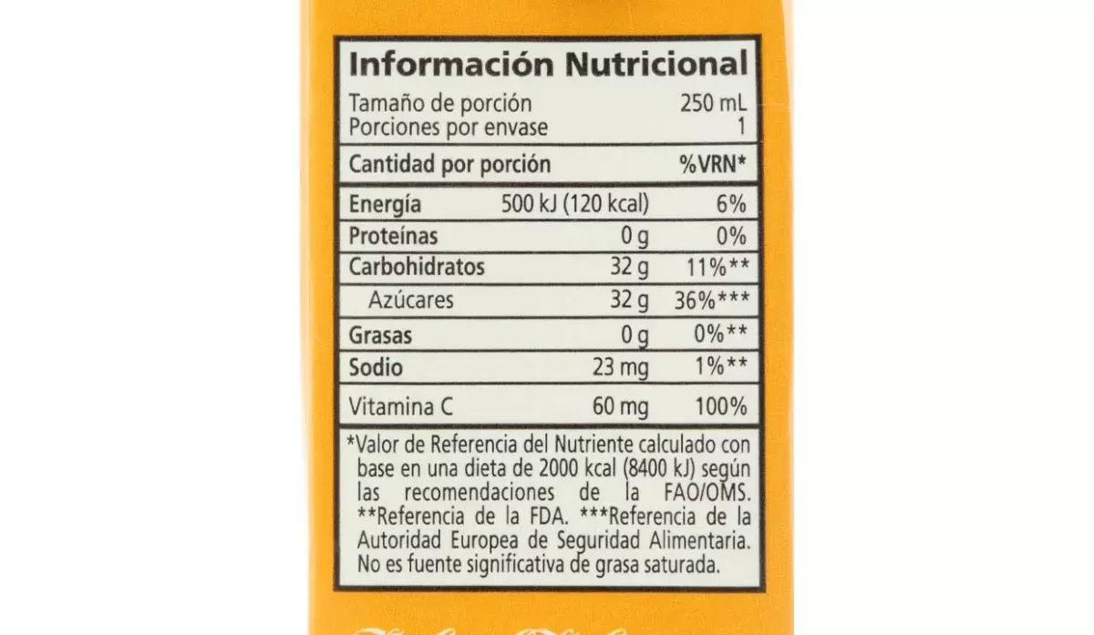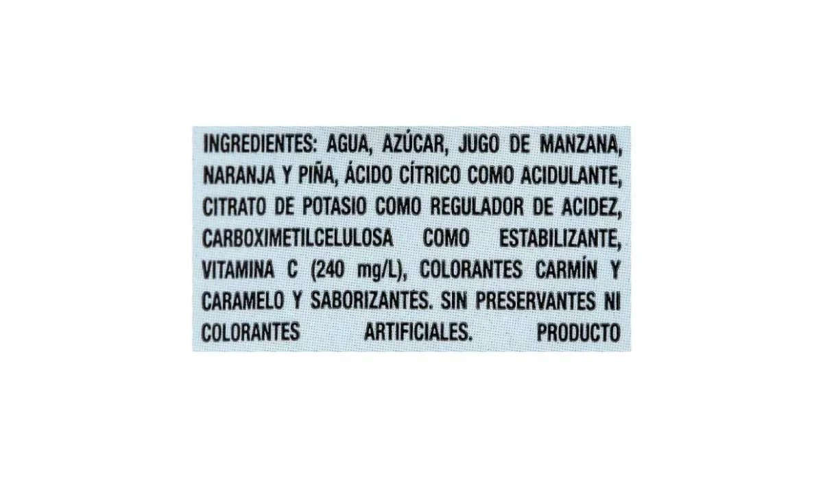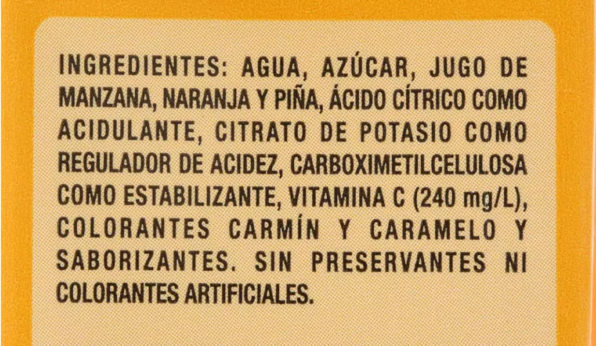 | Ingredientes | Agua, jugo de manzana, naranja, piña, azúcar y vitamina C |