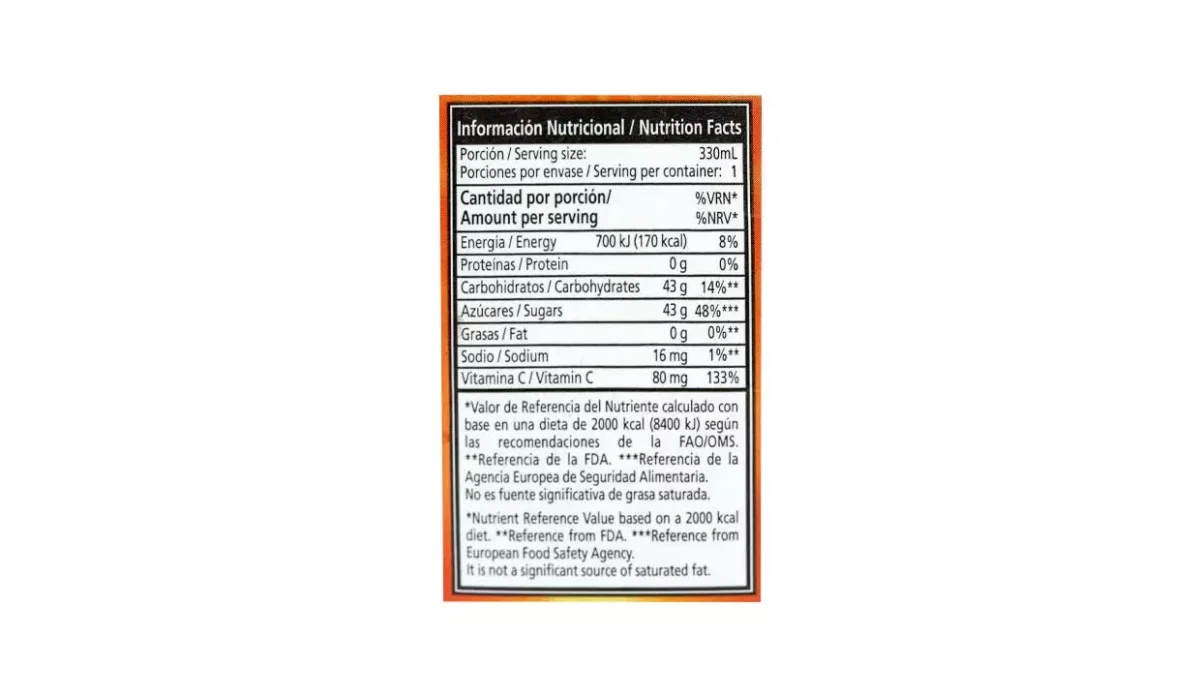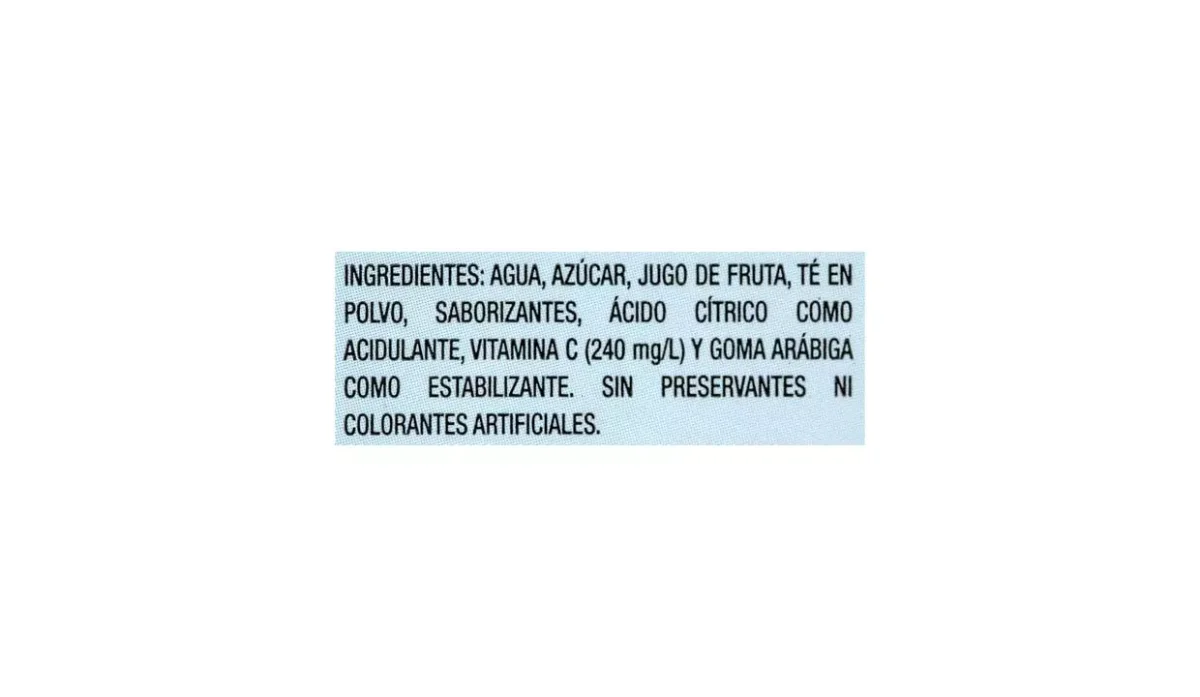 | Ingredientes | Agua, jugo de fruta, té en polvo, azúcar y vitamina C |