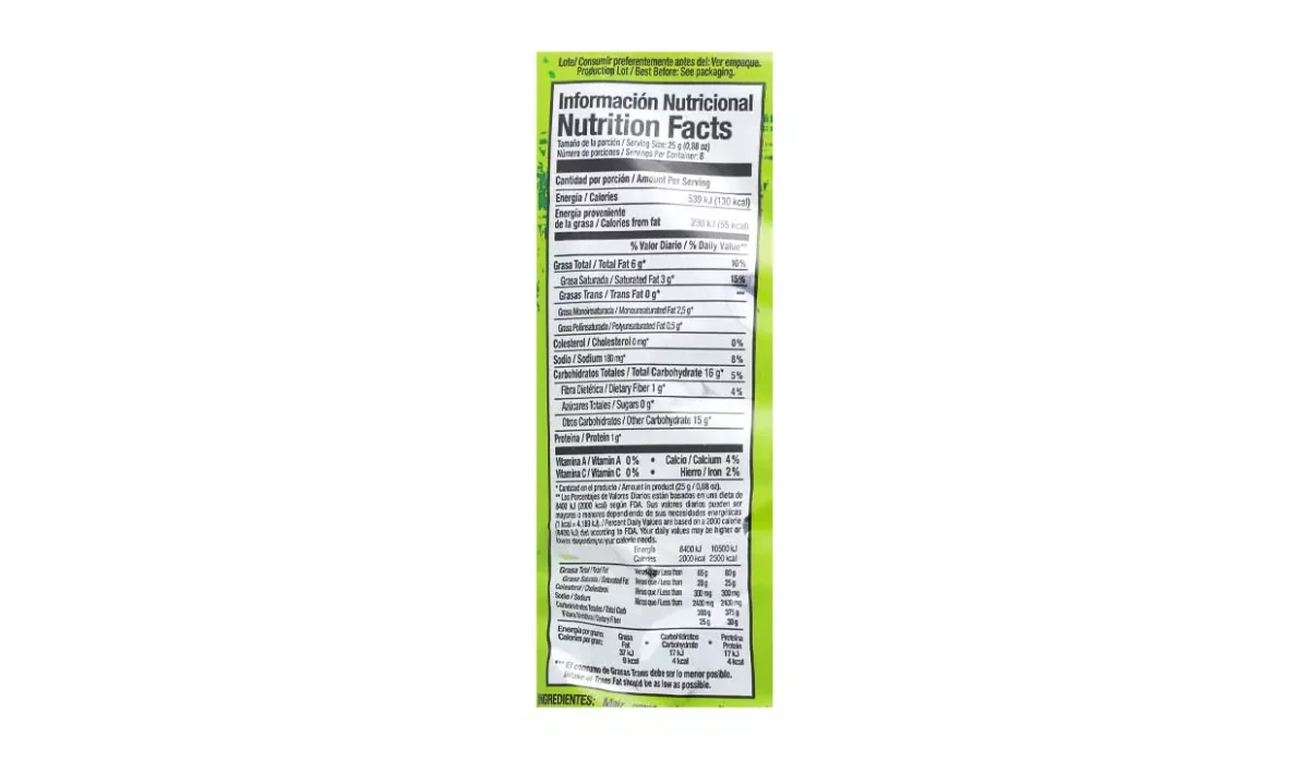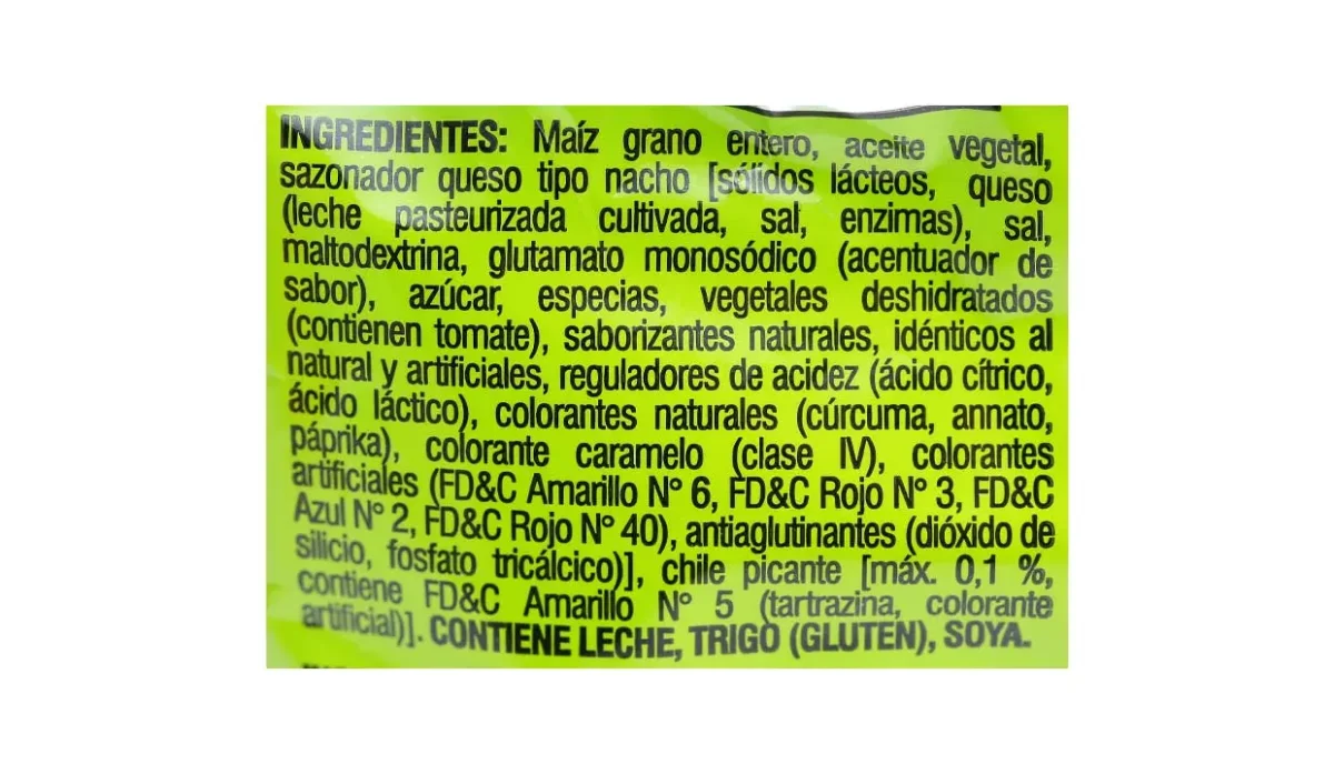 | Ingredientes | Maíz, aceite vegetal, queso tipo nacho, chile picante, leche, trigo y soya |