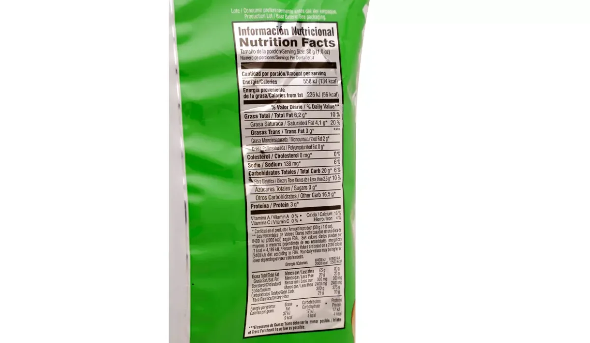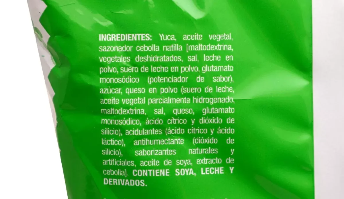 | Ingredientes | Yuca, aceite vegetal, sazonador de cebolla y natilla, sal, soya y leche |