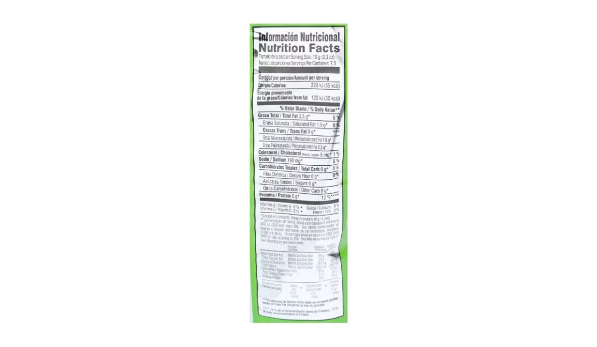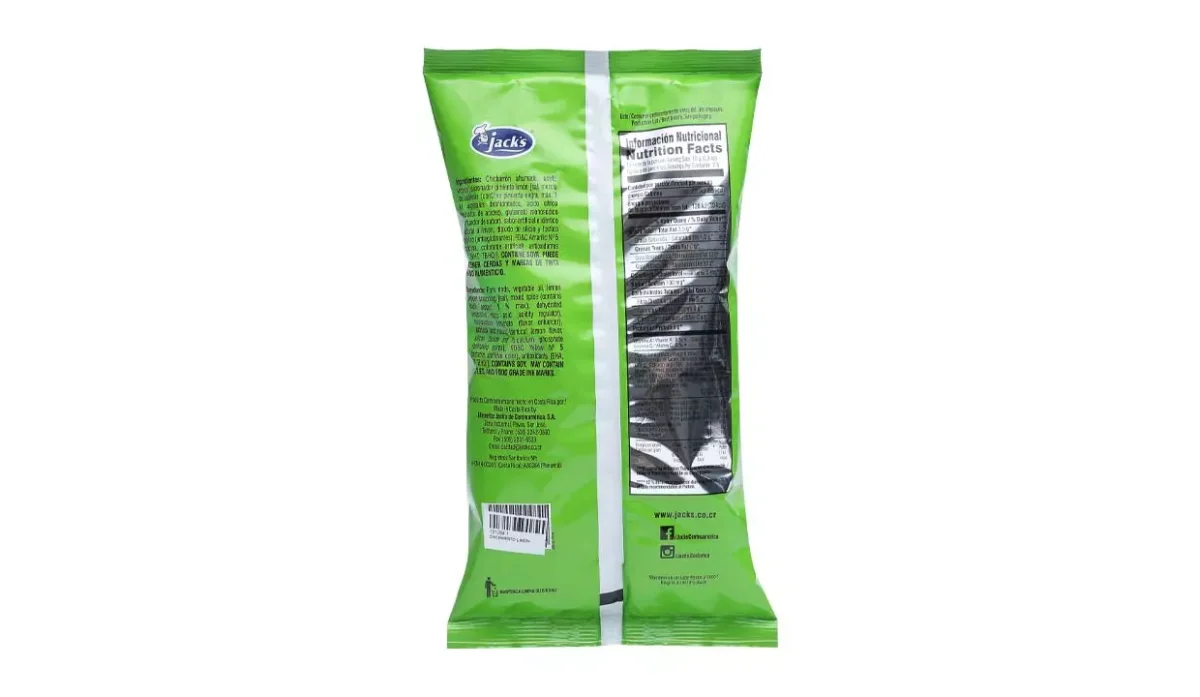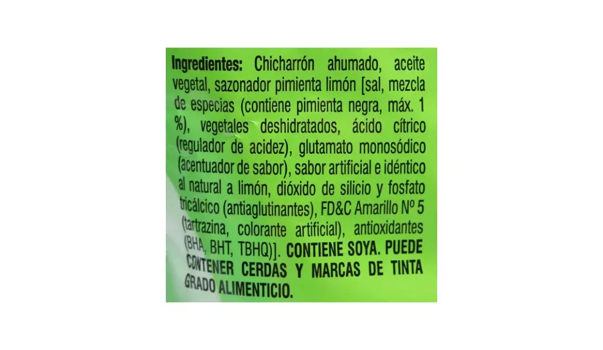 | Ingredientes | Chicharrón ahumado, aceite vegetal, pimienta, limón, sal y soya |