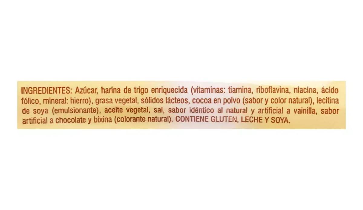 | Ingredientes | Cobertura de chocolate, sabor artificial a vainilla, azúcar, trigo, leche y soya |