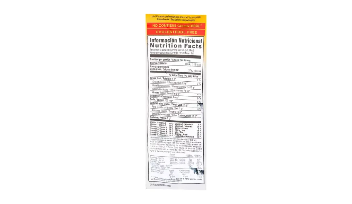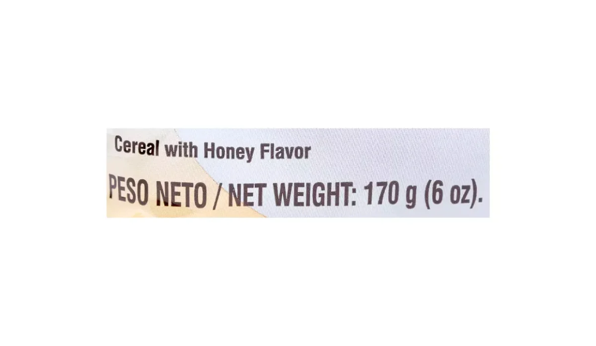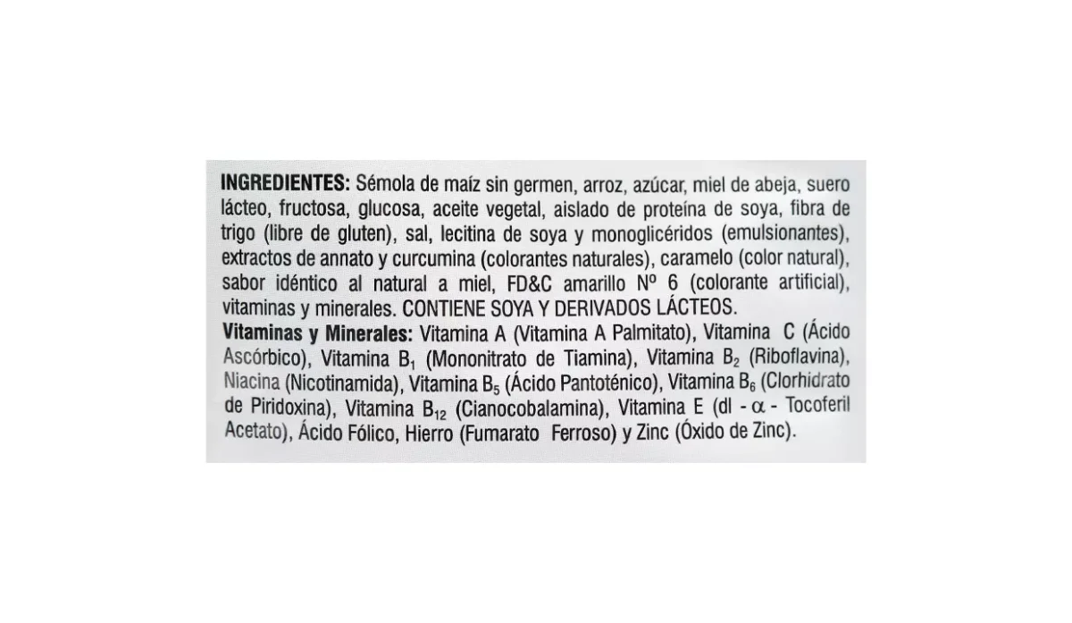 | Ingredientes | Sémola de maíz, azúcar, glucosa, extracto de malta, fibra de trigo, sal, aceite vegetal, proteína de soya y sabor a artificial a miel |