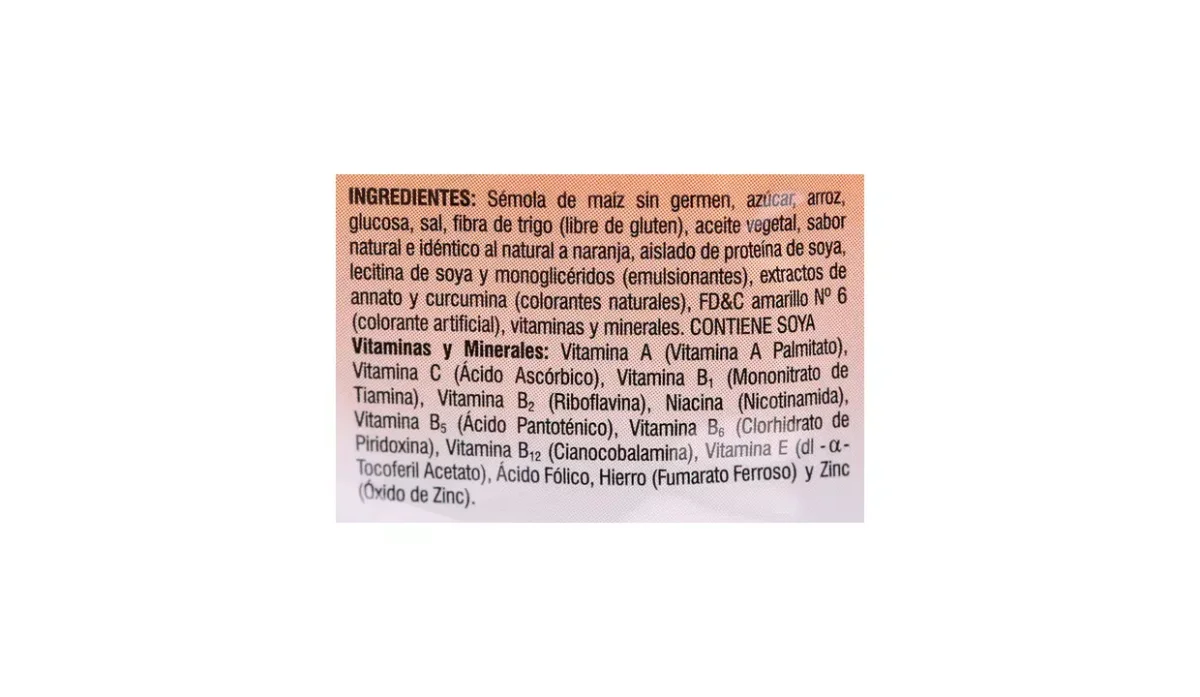 | Ingredientes | Sémola de maíz, azúcar, glucosa, extracto de malta, fibra de trigo, sal, aceite vegetal, proteína de soya y sabor artificial a naranja |