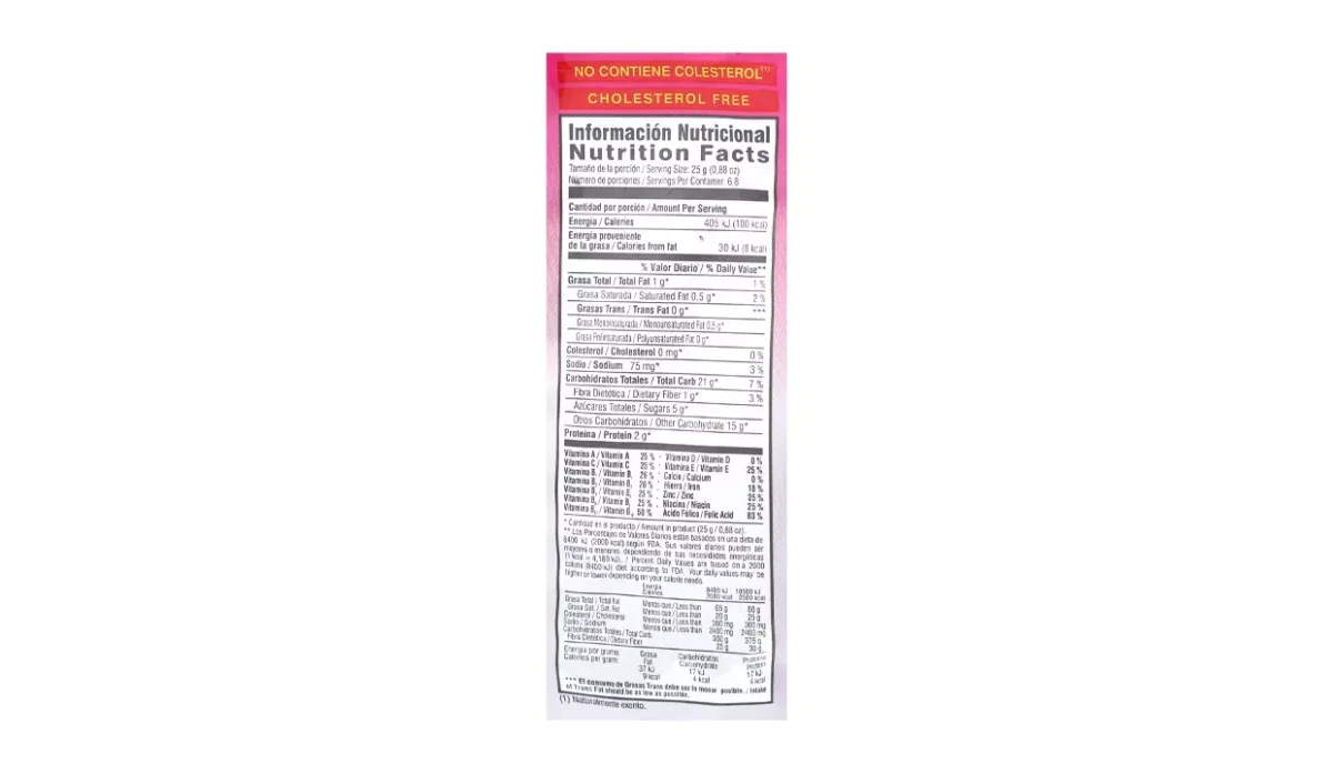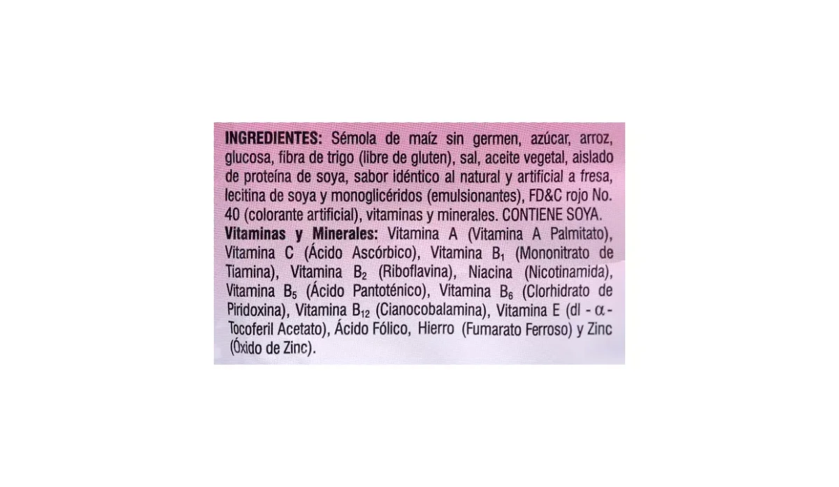 | Ingredientes | Sémola de maíz, azúcar, glucosa, extracto de malta, fibra de trigo, sal, aceite vegetal, proteína de soya y sabor artificial a fresa |