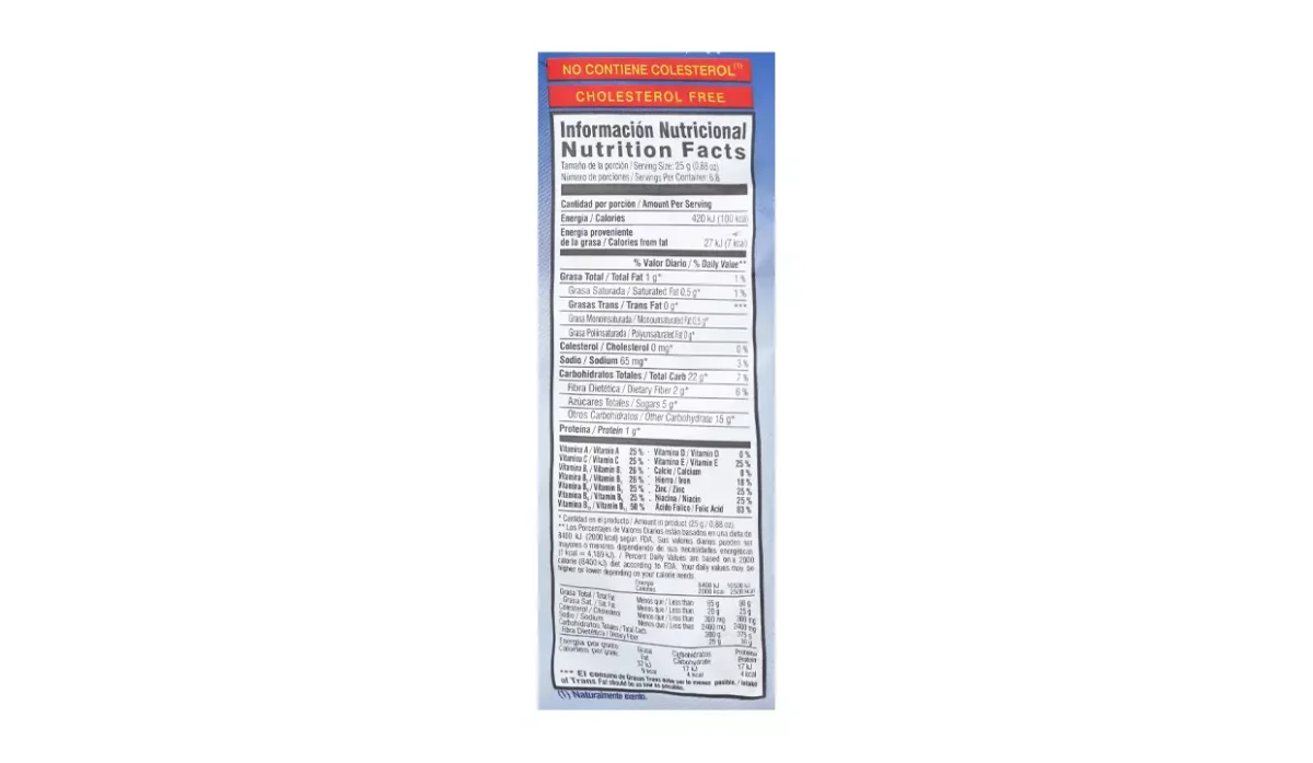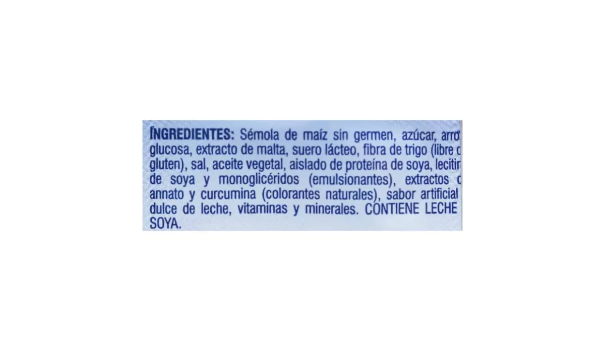 | Ingredientes | Sémola de maíz, azúcar, glucosa, extracto de malta, fibra de trigo, sal, aceite vegetal, proteína de soya y sabor artificial a dulce de leche |