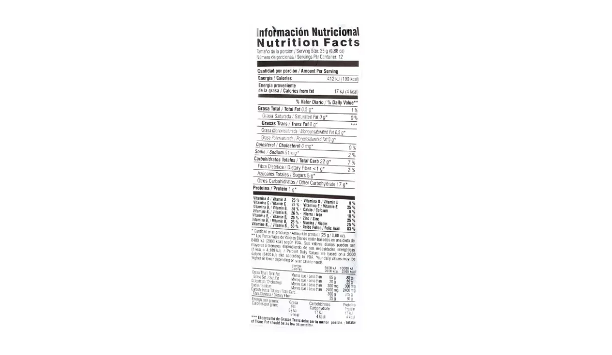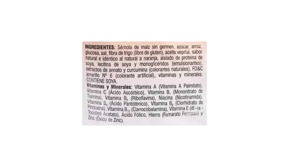 | Ingredientes | Sémola de maíz, azúcar, glucosa, extracto de malta, fibra de trigo, sal, aceite vegetal, proteína de soya y sabor artificial a naranja |