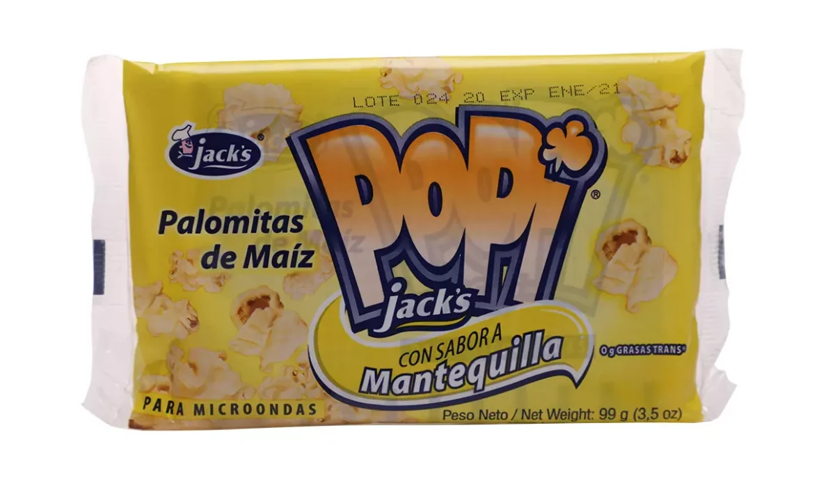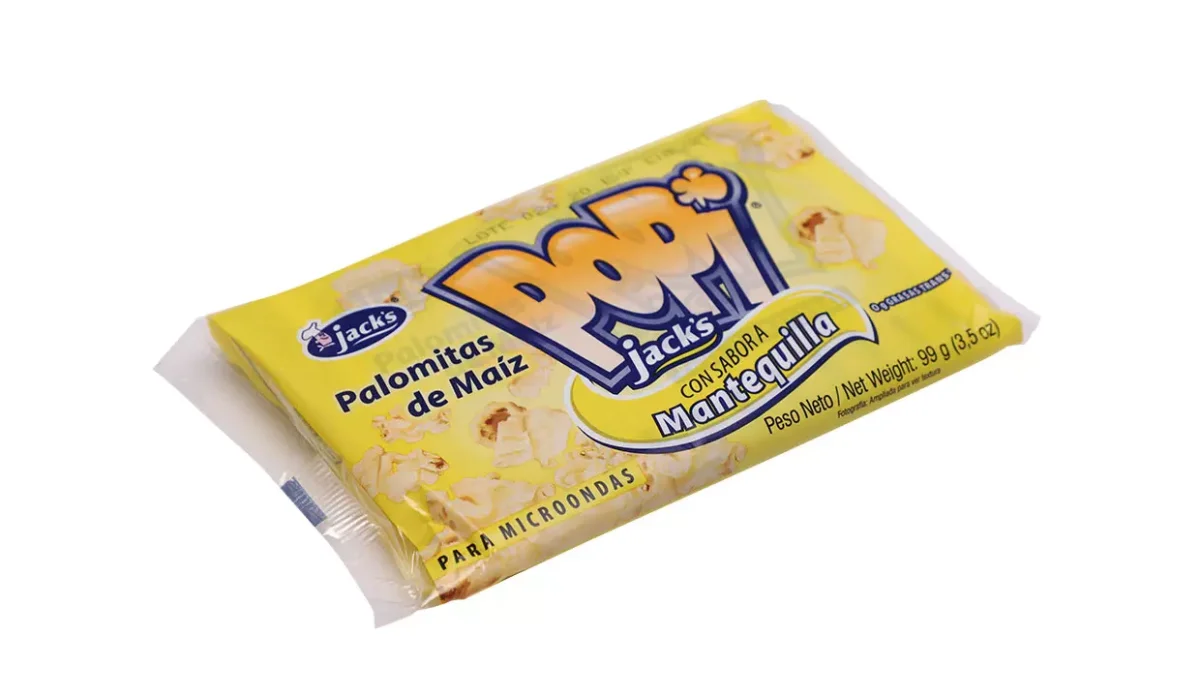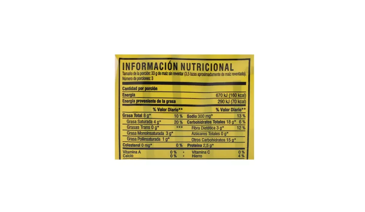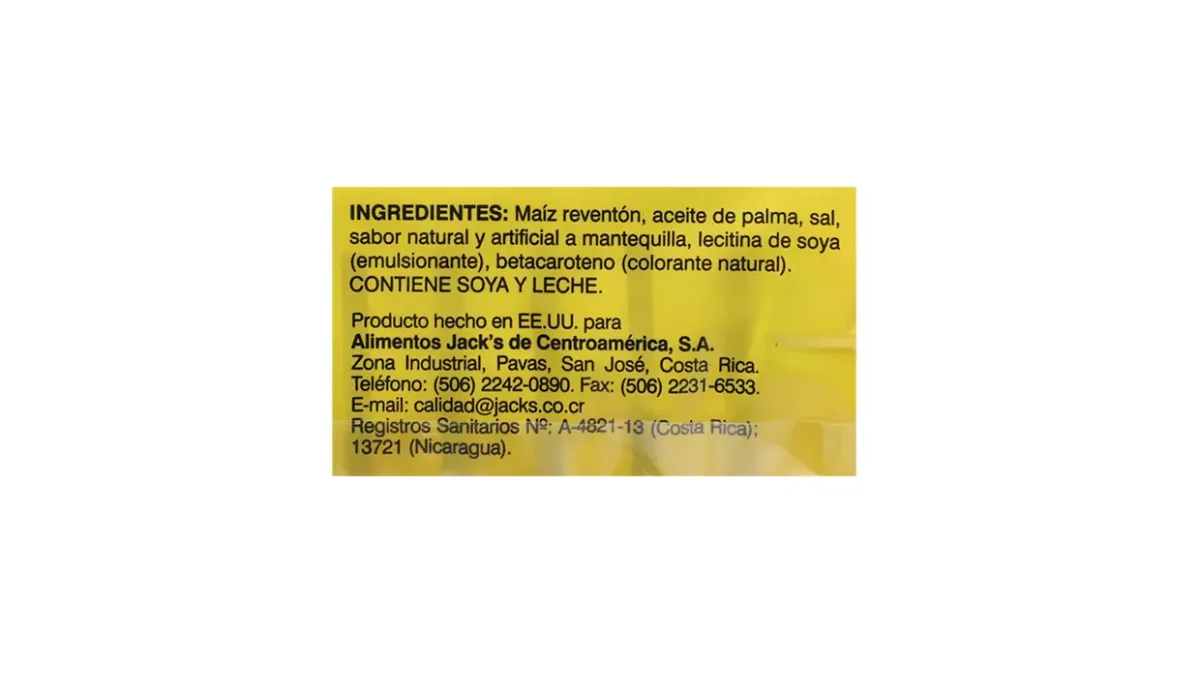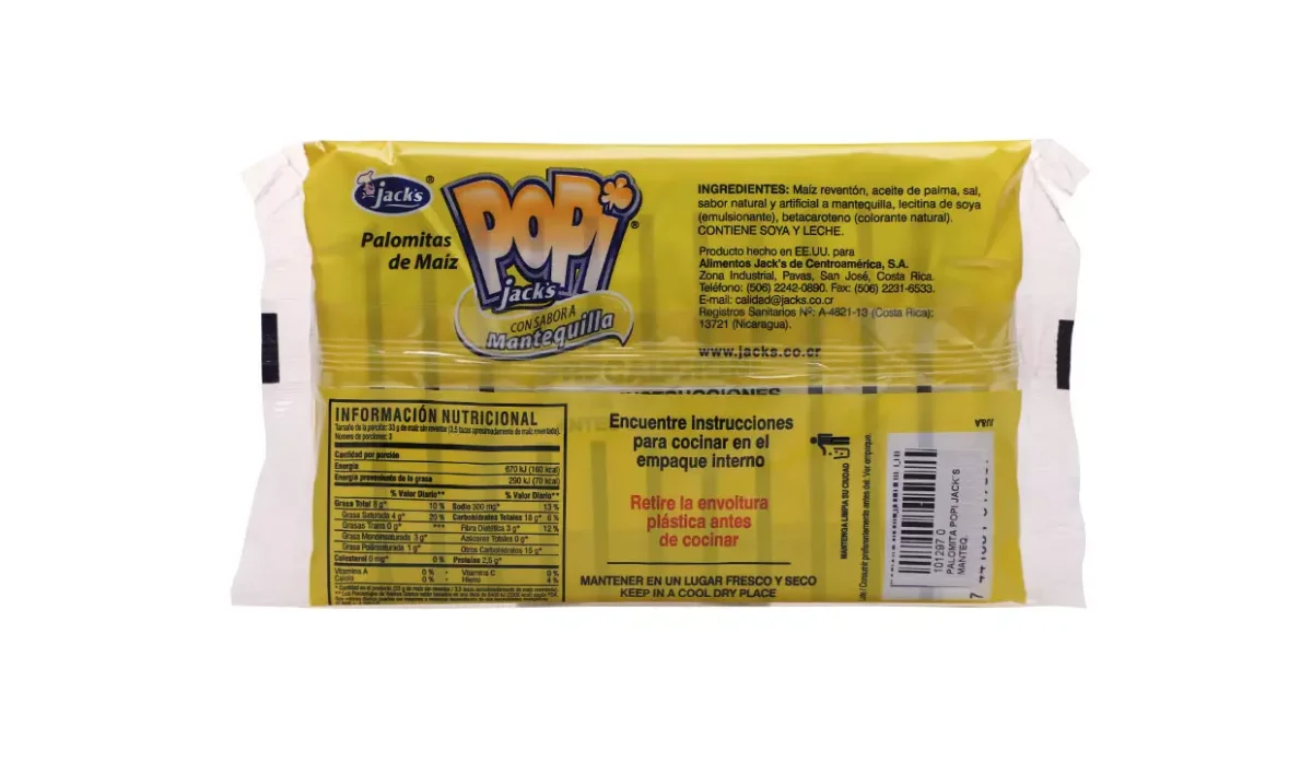 | Ingredientes | Maíz reventón, aceite de palma, sal, sabor natural y artificial a mantequilla, soya y leche |