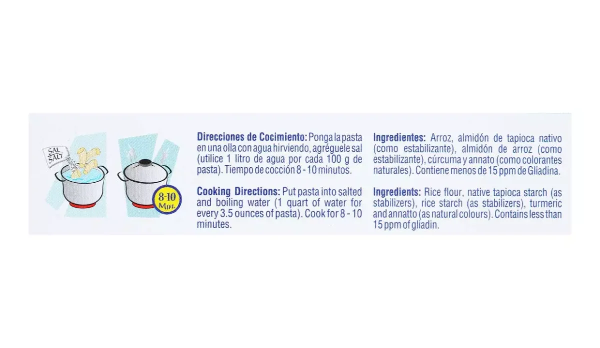 | Ingredientes | Arroz, almidón de tapioca nativo, almidón de arroz, cúrcuma y gliadina |