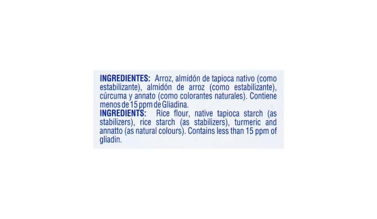 | Ingredientes | Arroz, almidón de tapioca nativo, almidón de arroz, cúrcuma y gliadina |