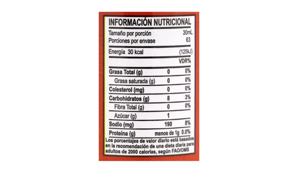 | Ingredientes | Agua, azúcar, pasta de tomate, almidón de maíz, sal, especias, gluten y soya |