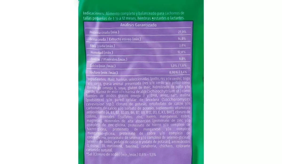 | Ingredientes | Cereales molidos, carne y hueso de res, cerdo y pollo y aceite de pescado |
