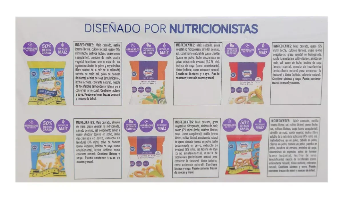 | Incluye | 1 paquete de: biscolite, biscolite picantes, palitos de maíz con queso lite, palitos de maíz con queso cheddar, rosquillas de maíz y queso tradicionales, rosquillas de maíz y queso cheddar |