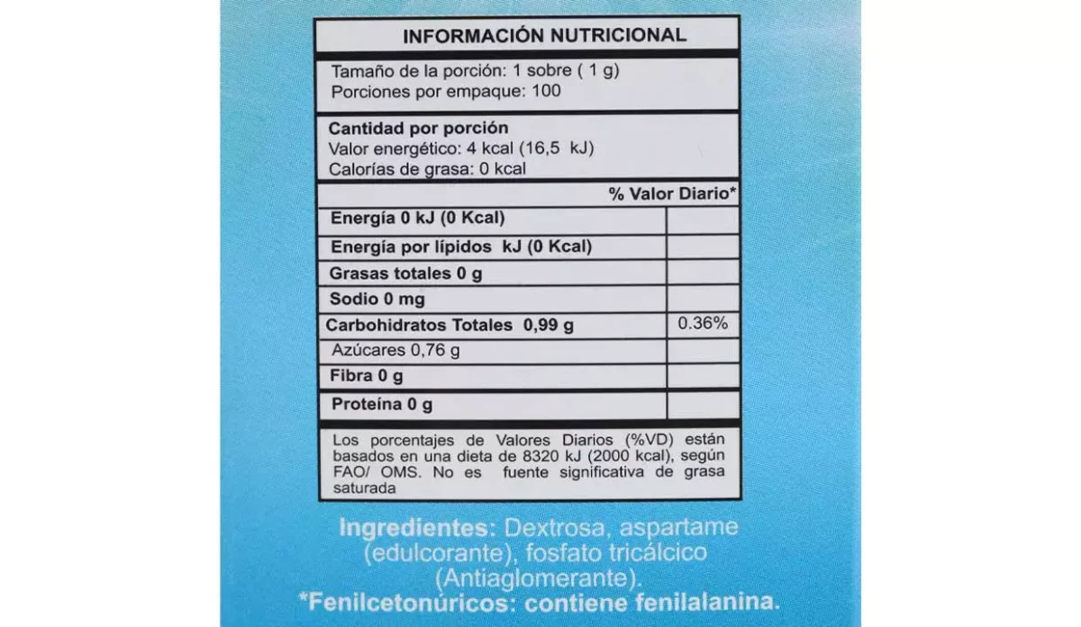 | Ingredientes | Dextrosa, aspartame, fosfato tricálcio y fenilalanina |