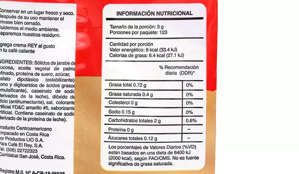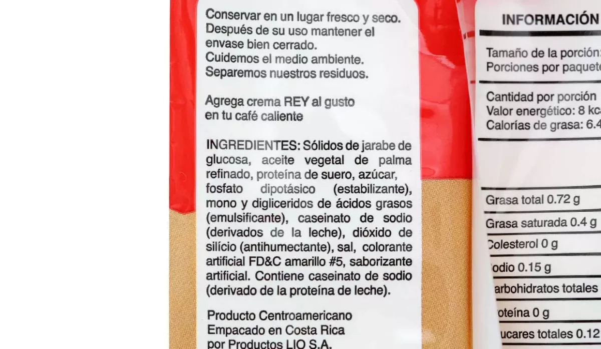 | Ingredientes | Caseinato de sodio (derivado de la proteína de la leche) y azúcar |