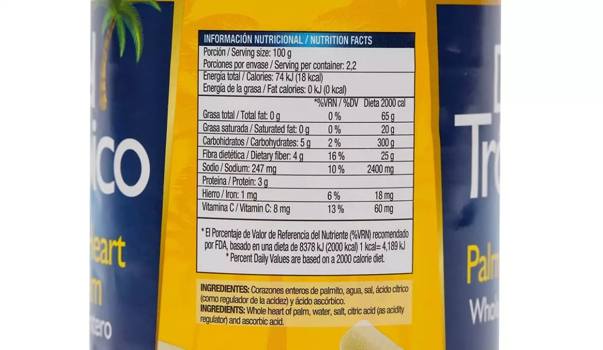 | Ingredientes | Corazones enteros de palmito, agua y sal |