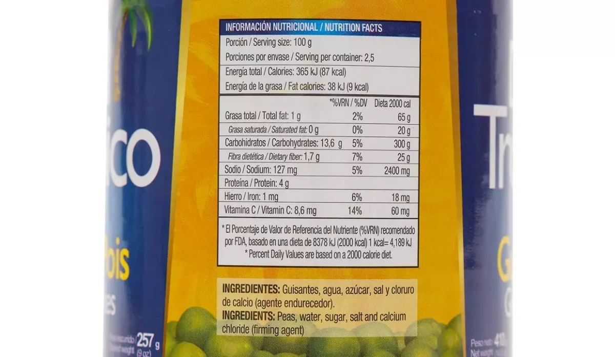 | Ingredientes | Guisantes, agua, azúcar y sal |