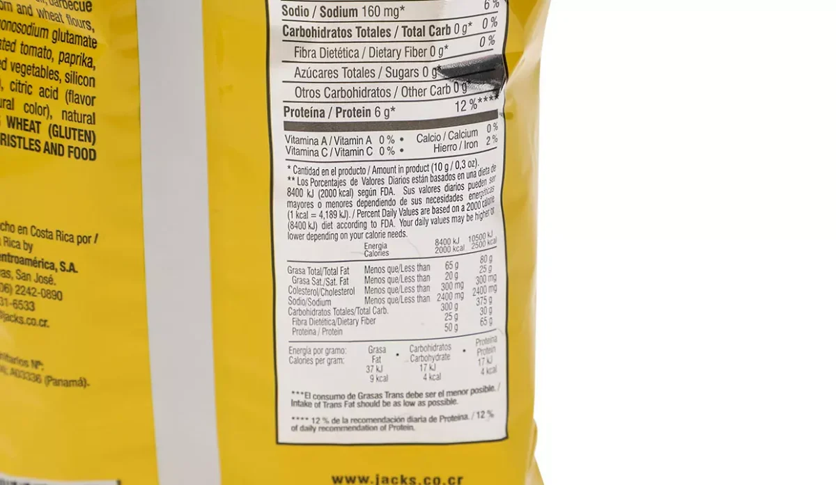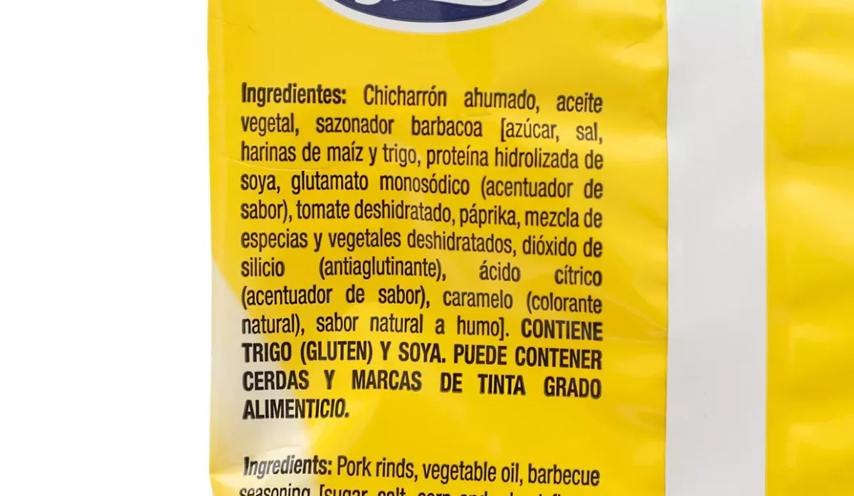 | Ingredientes | Chicharrón ahumado, aceite vegetal, sazonador barbacoa y soya |
