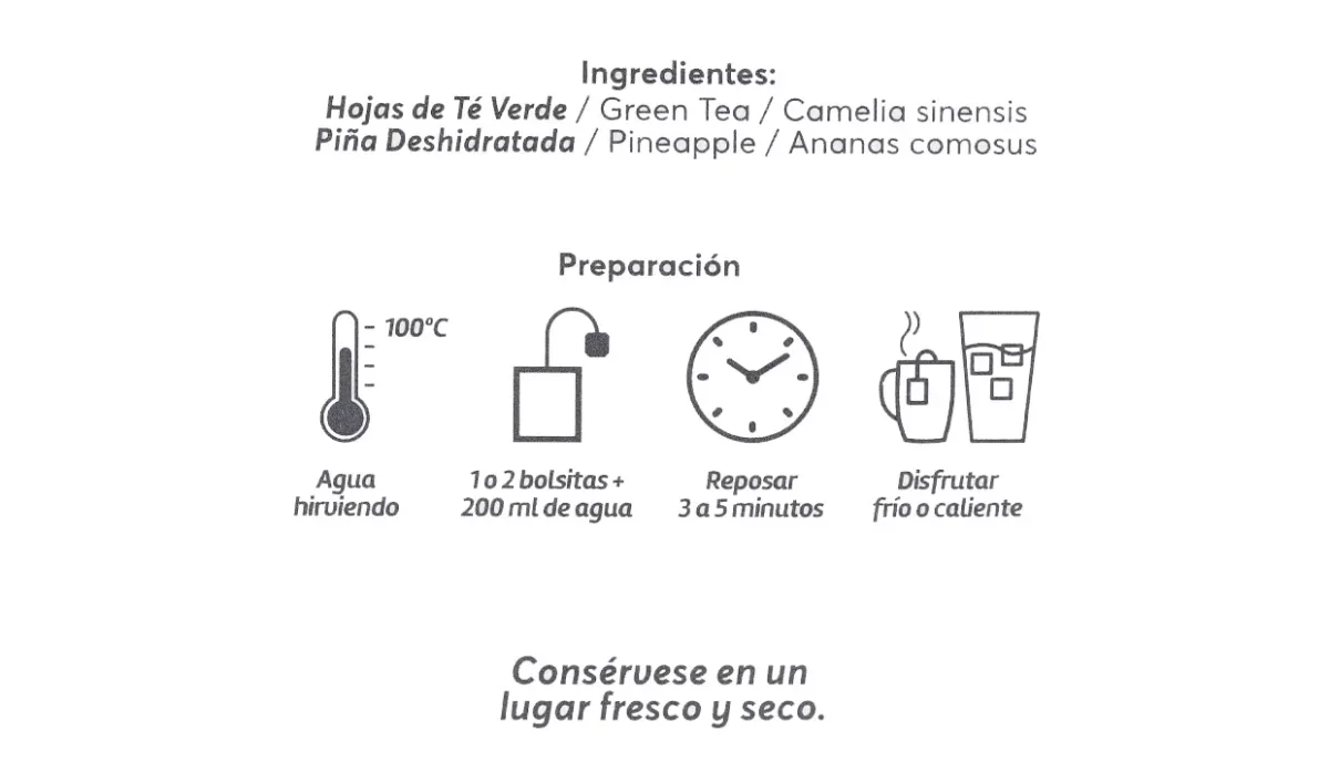| Ingredientes | Hojas de té verde y piña deshidratada |