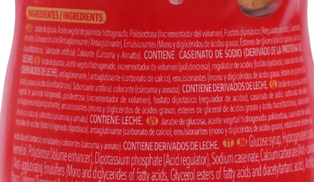 | Ingredientes | Sólidos de maíz, aceite vegetal, caseinato de sodio y derivados de leche |