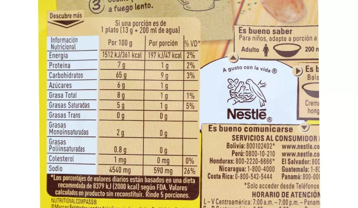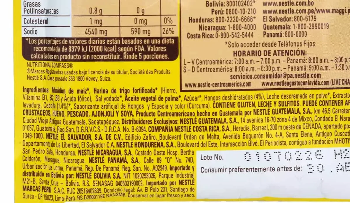 | Ingredientes | Harina de trigo, almidón de maíz, aceite vegetal de palma, sal yodada, hongos deshidratados, cebolla y cúrcuma |