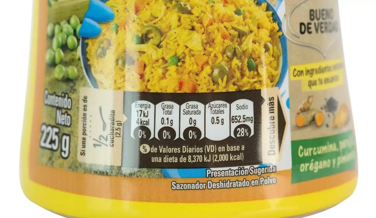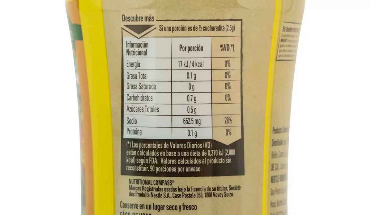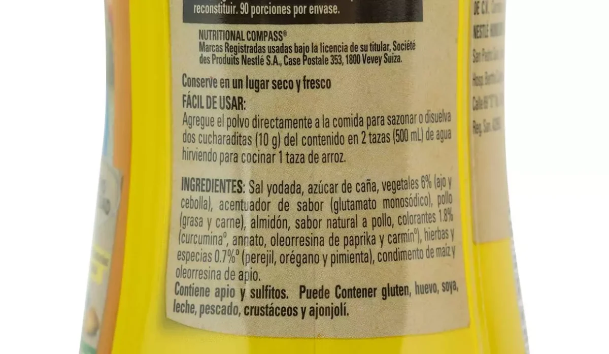 | Ingredientes | Sal yodada, almidón de maíz, azúcar, acentuadores de sabor, grasa vegetal, carne de pollo, grasa de pollo, colorantes artificiales, cebolla, ajo, apio, perejil y hierbas |