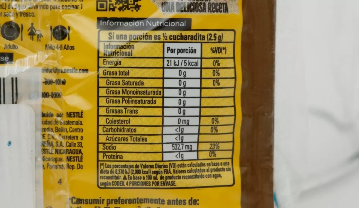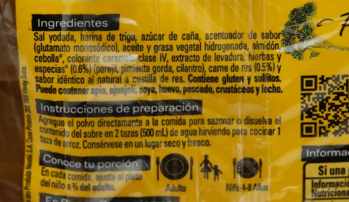 | Ingredientes | Sal yodada, almidón de maíz, azúcar, acentuadores de sabor, grasa vegetal, carne de res, cebolla, cilantro, perejil y laurel |