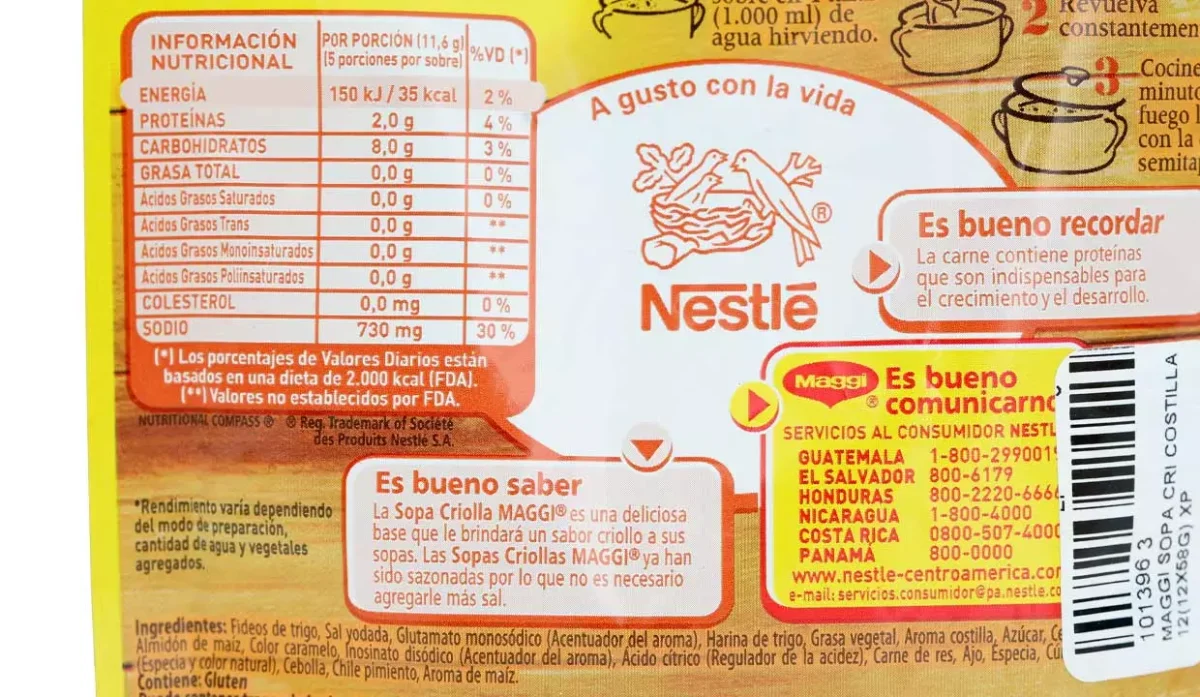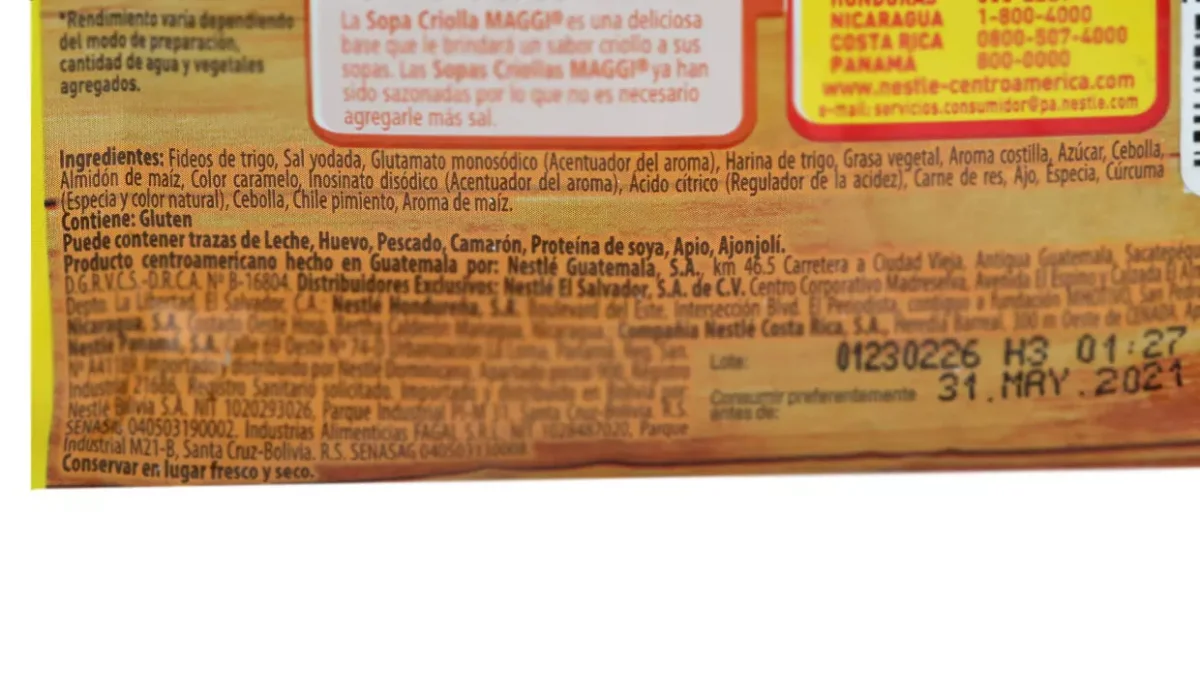 | Ingredientes | Fideos de trigo, sal yodada, harina de trigo, azúcar, grasa vegetal, carne de res, cebolla, ajo, especias y cúrcuma |