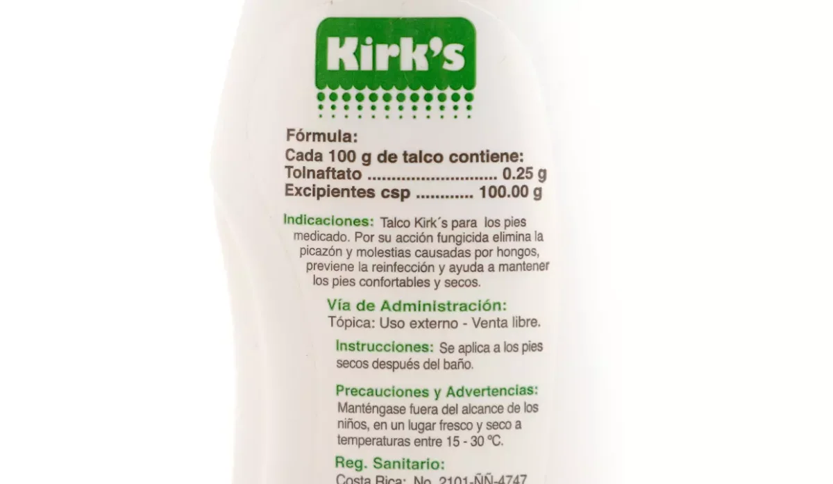 | Ingredientes | Cada 100g de talco contiene: tolnaftato (0.25g) y excipientes csp (100.00g) |