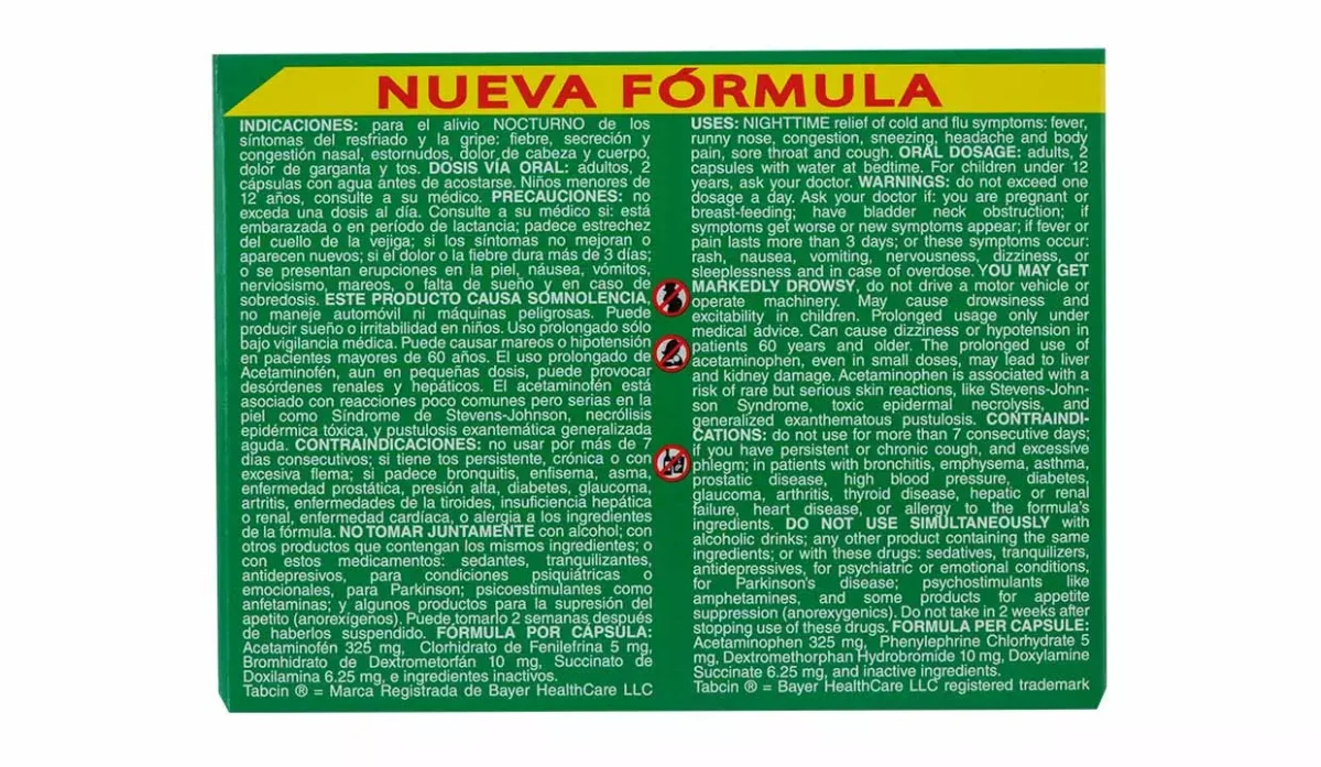 | Ingredientes | Acetaminofén 250mg, clorhidrato de fenilefrina 5mg, bromhidrato de dextrometorfán 10mg, succinato de doxilamina 6,25mg e ingredientes activos |