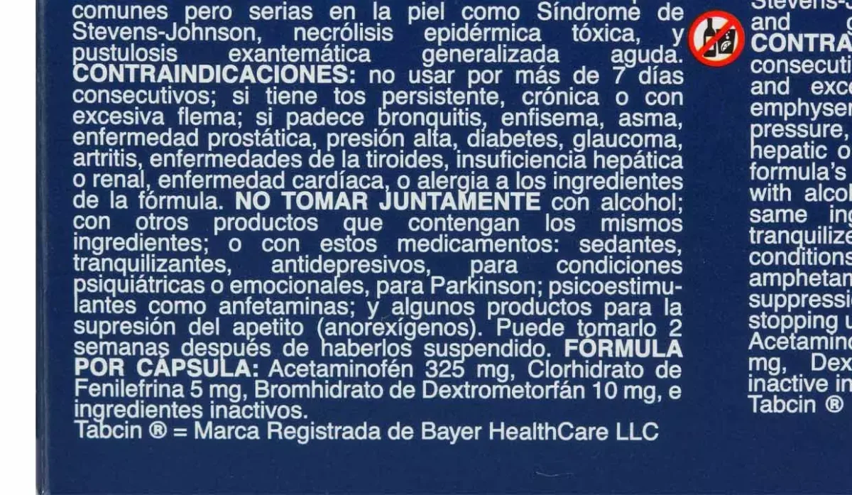 | Ingredientes | Acetaminofén 325mg, clorhidrato de fenilefrina 5mg, bromhidrato de dextrometorfán 10mg e ingredientes activos |