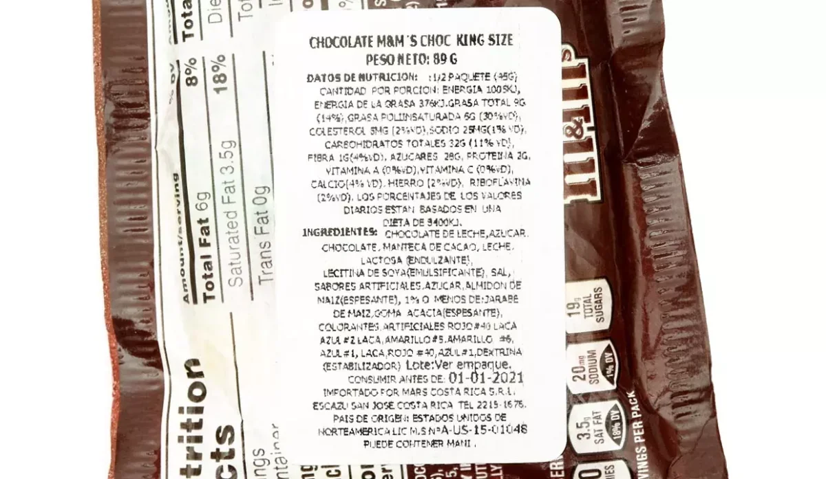 | Ingredientes | Chocolate de leche, azúcar, manteca de cacao, chocolate, leche, soya, sal, azúcar, saborizantes artificiales, almidón de maíz, jarabe de maíz y colorantes |