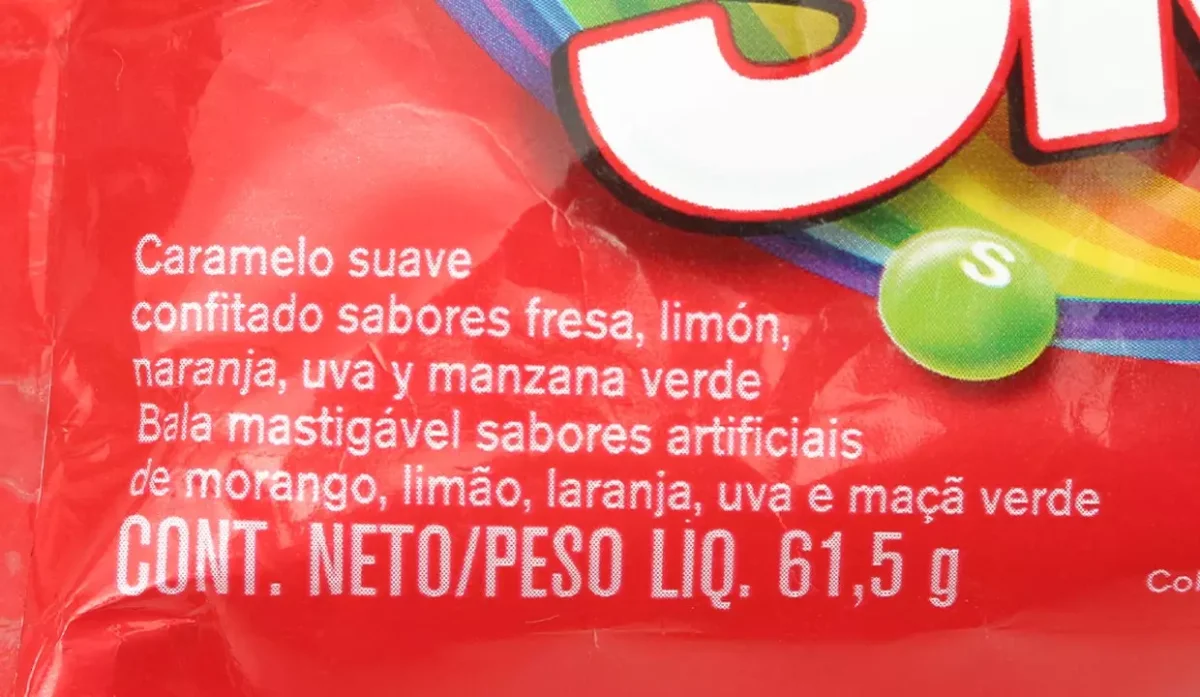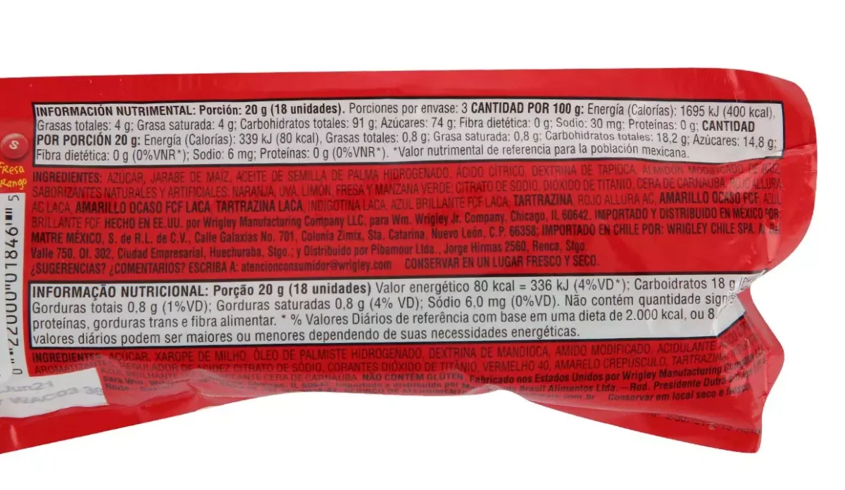 | Ingredientes | Azúcar, jarabe de maíz, aceite de semilla de palma, ácido cítrico, almidón modificado de maíz, saborizantes naturales y artificiales a fresa, limón, uva, naranja y manzana verde |