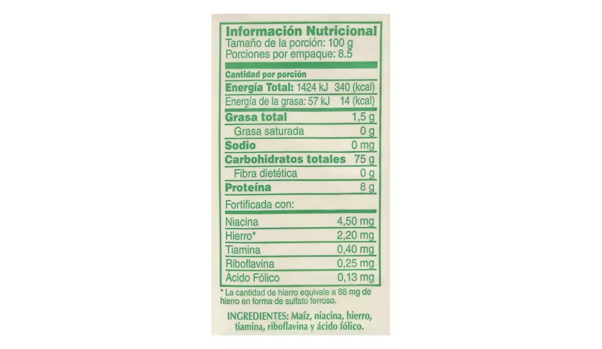 | Ingredientes | Maíz, niacina, hierro, tiamina, riboflavina y ácido fólico |