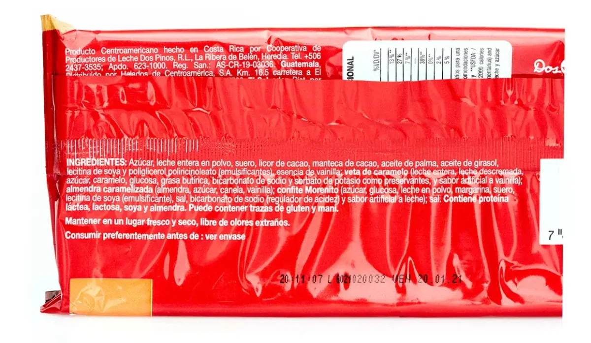 | Característica | Cobertura sabor a chocolate con leche de caramelo, almendras caramelizadas, confite morenito y sal |