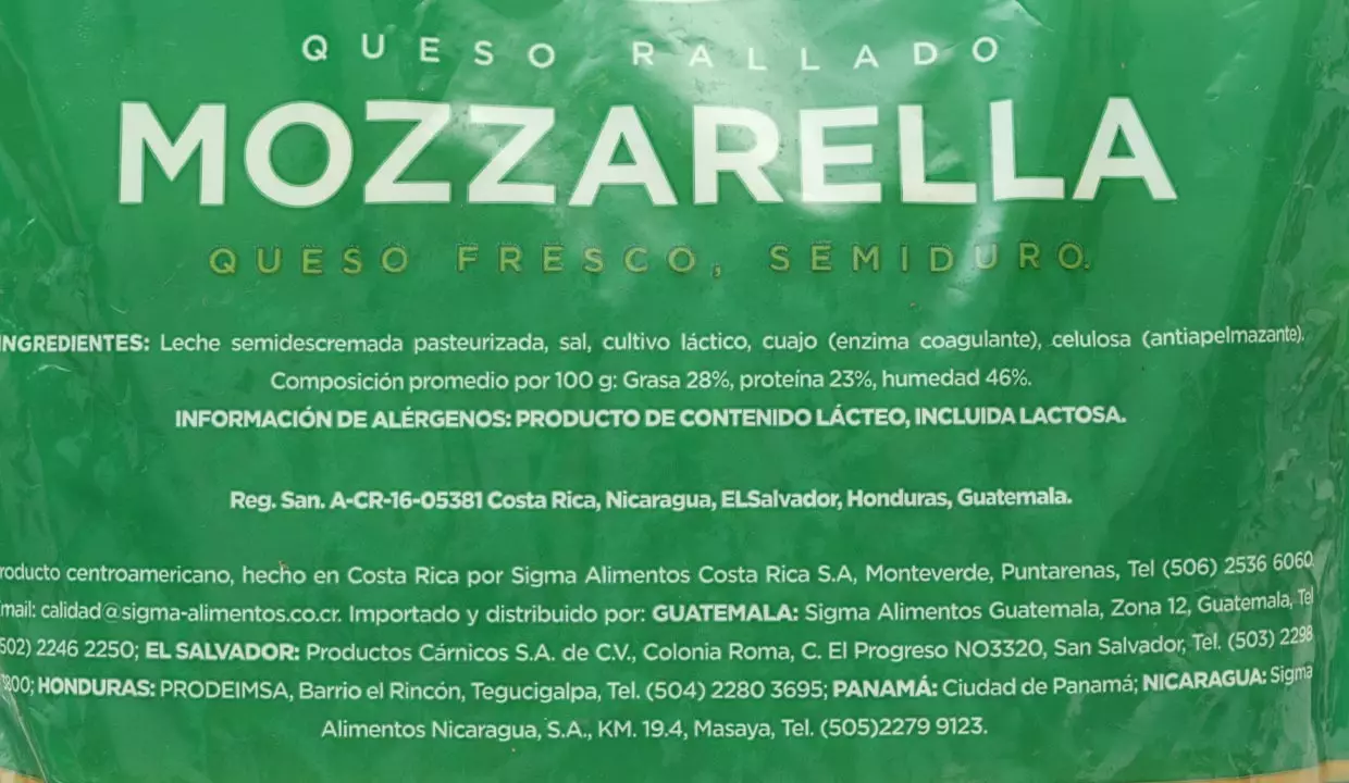 Ingredientes | Queso mozzarella , leche semidescremada, pasteurizada y sal |