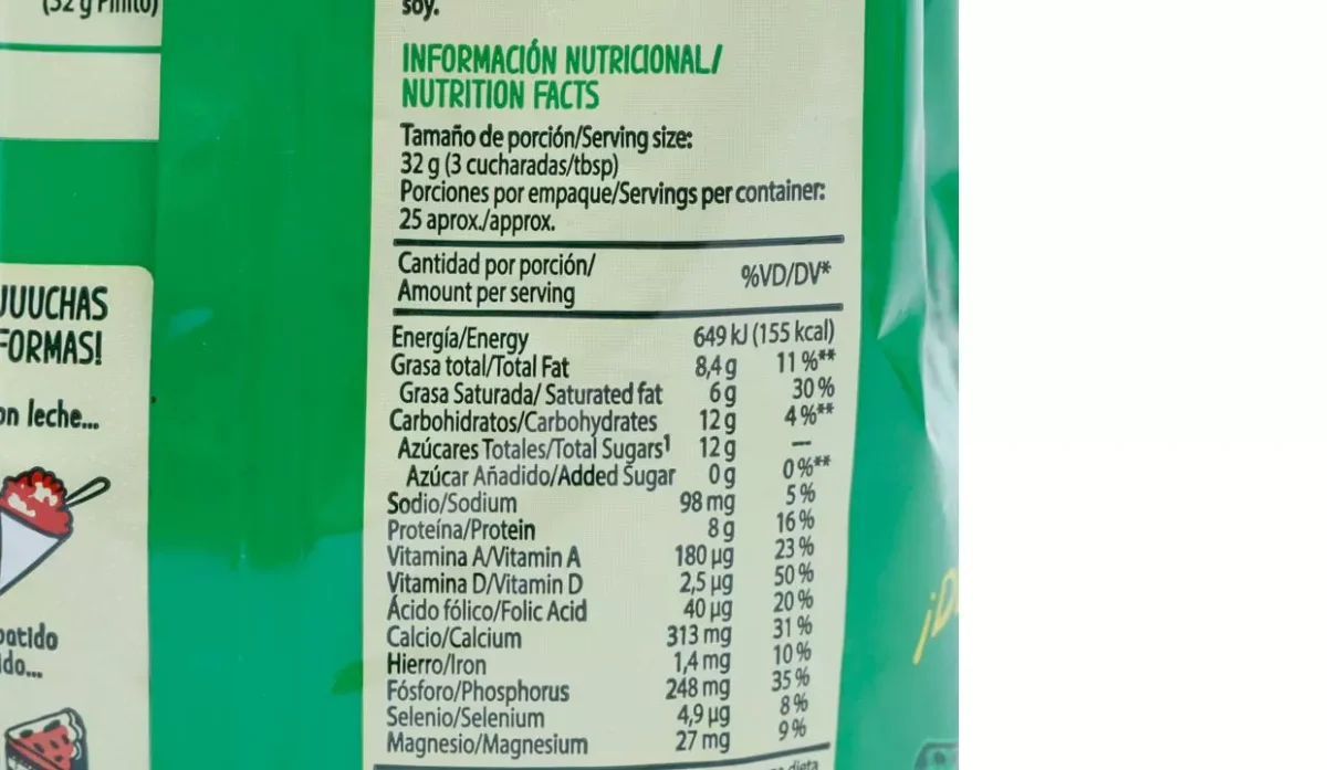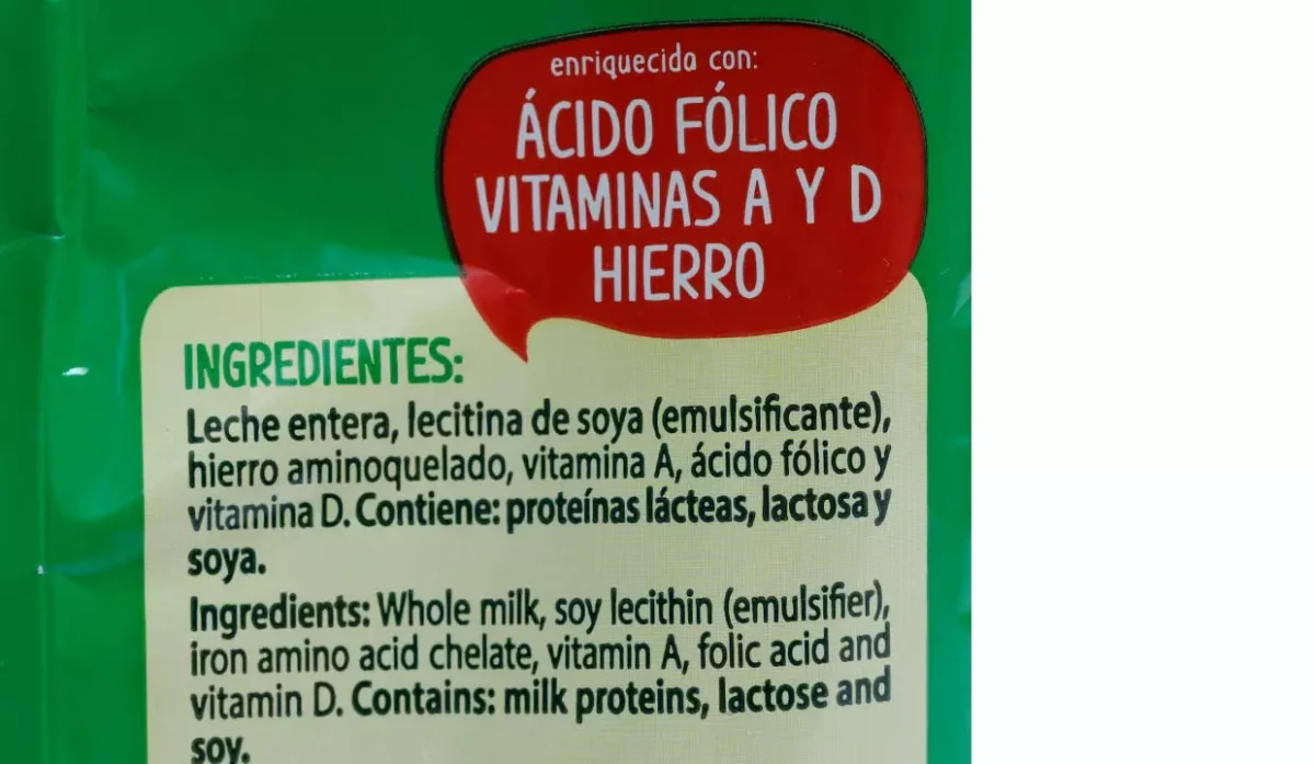 | Ingredientes | Leche entera, derivados de soya y proteína láctea |