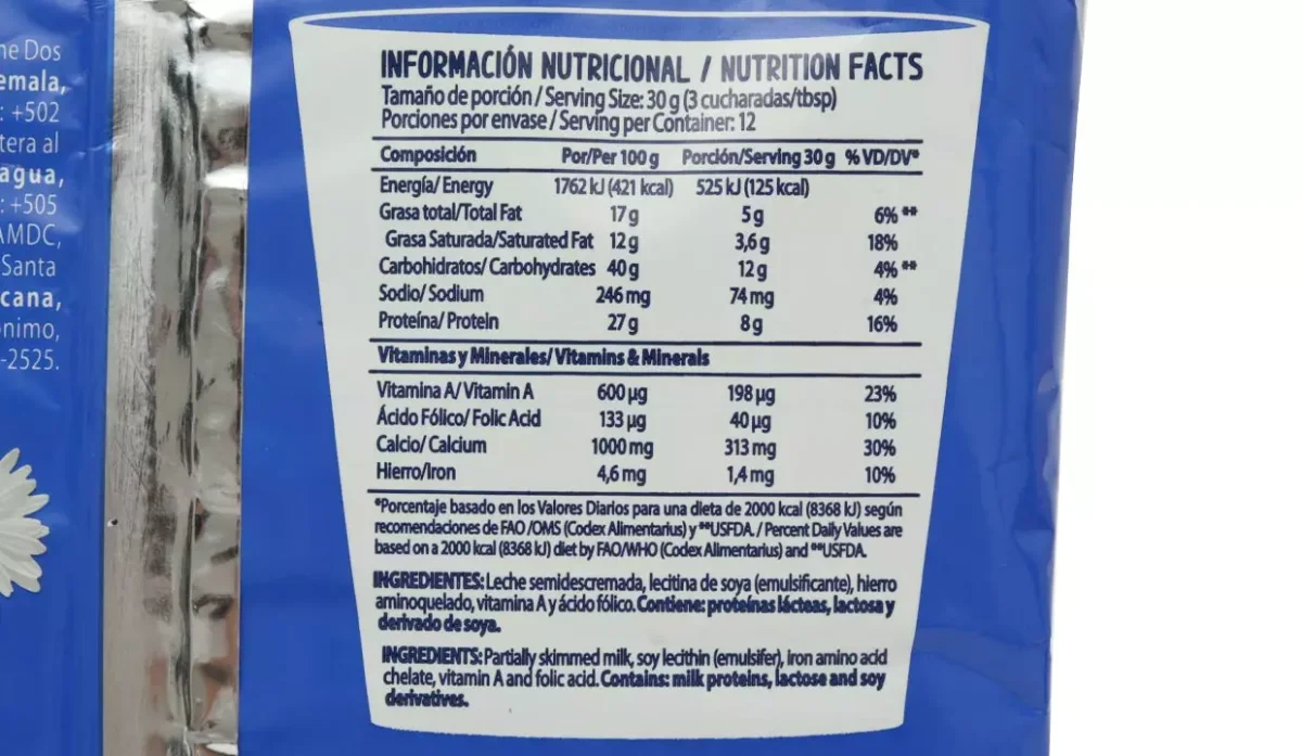 | Ingredientes | Leche semidescremada, derivados de soya y proteína láctea |