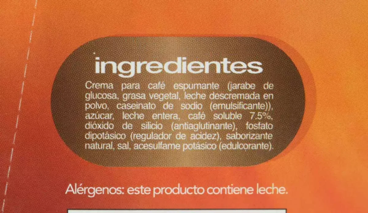 | Ingredientes | Café 100% arábica, crema para café espumante, grasa vegetal, leche descremada en polvo, azúcar, leche entera, café soluble y sal |