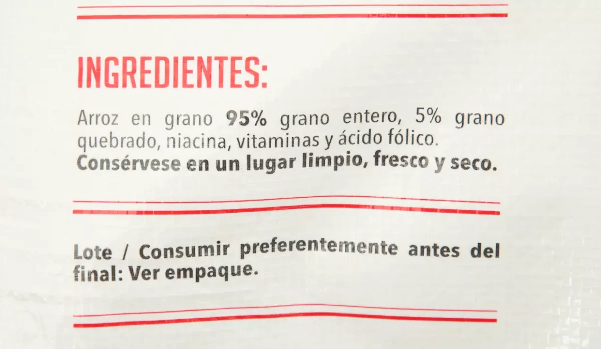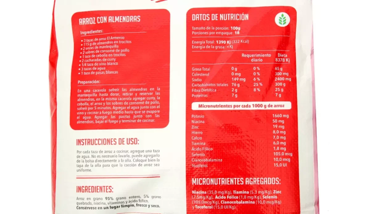 | Ingredientes | Grano entero (95%), grano quebrado (5%), niacina, vitaminas, y ácido fólico |