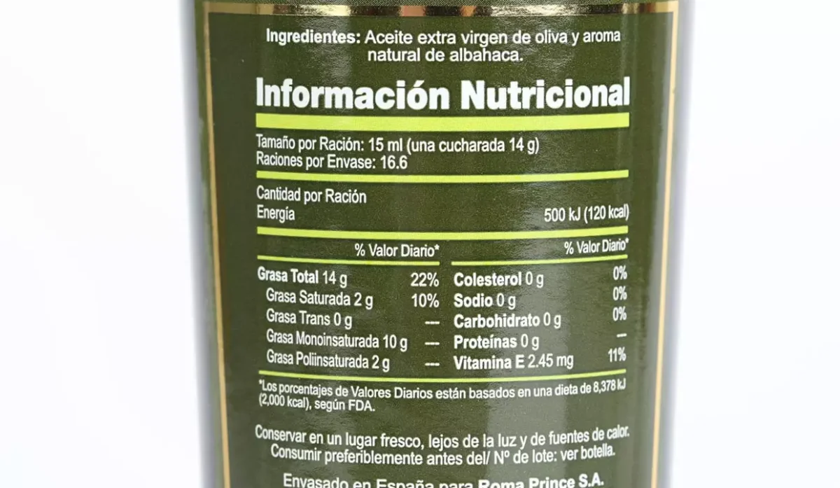 | Ingredientes | Aceite extra virgen de oliva y aroma natural a albahaca |