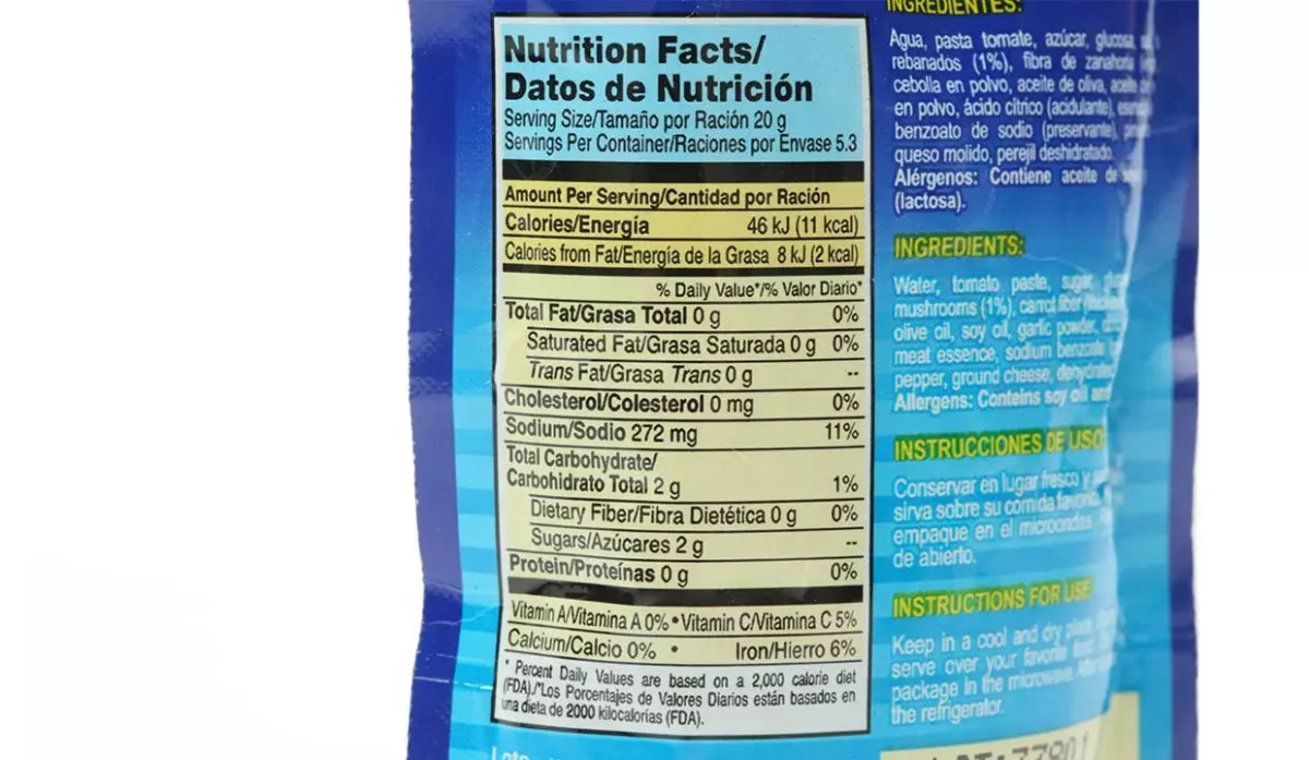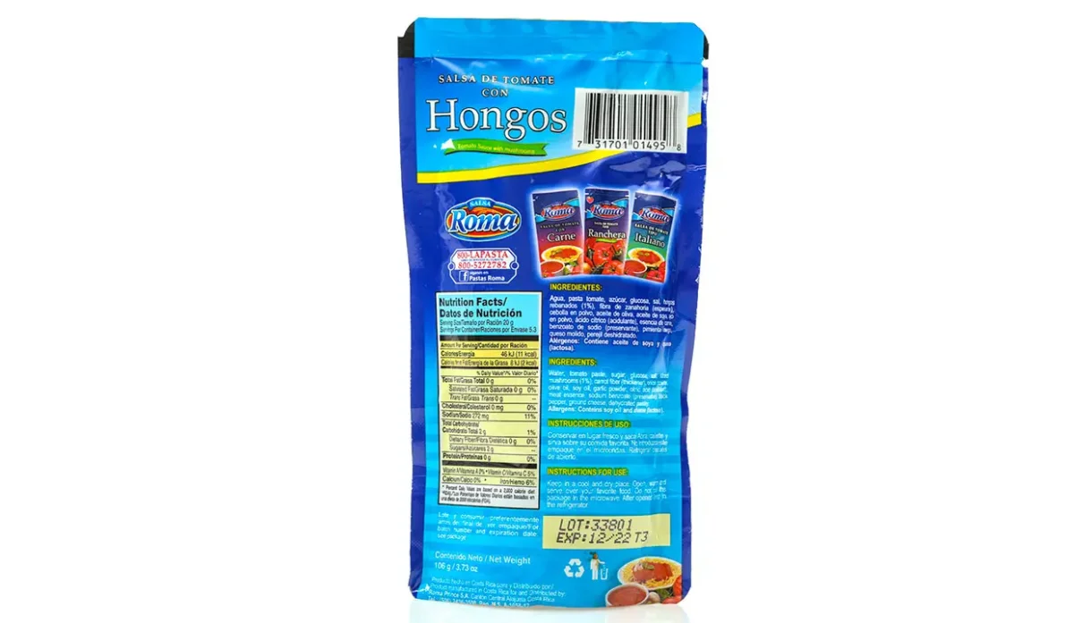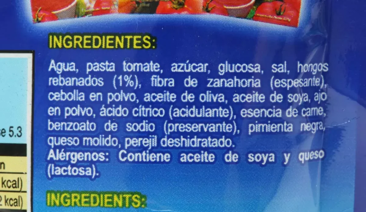 | Ingredientes | Agua, pasta de tomate, azúcar, sal, hongos rebanados, fibra de zanahoria, cebolla en polvo, aceite de oliva, aceite de soya, ajo en polvo, ácido cítrico, esencia de carne, pimienta negra, queso molido y perejil deshidratado |