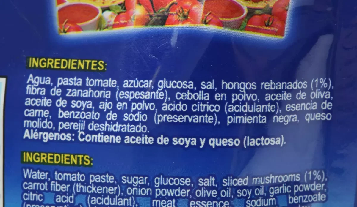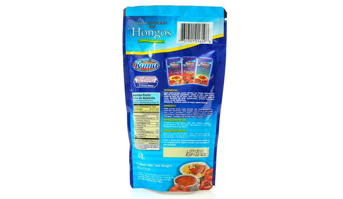 | Ingredientes | Agua, pasta de tomate, azúcar, sal, hongos rebanados, fibra de zanahoria, cebolla en polvo, aceite de oliva, aceite de soya, ajo en polvo, ácido cítrico, esencia de carne, pimienta negra, queso molido y perejil deshidratado |
