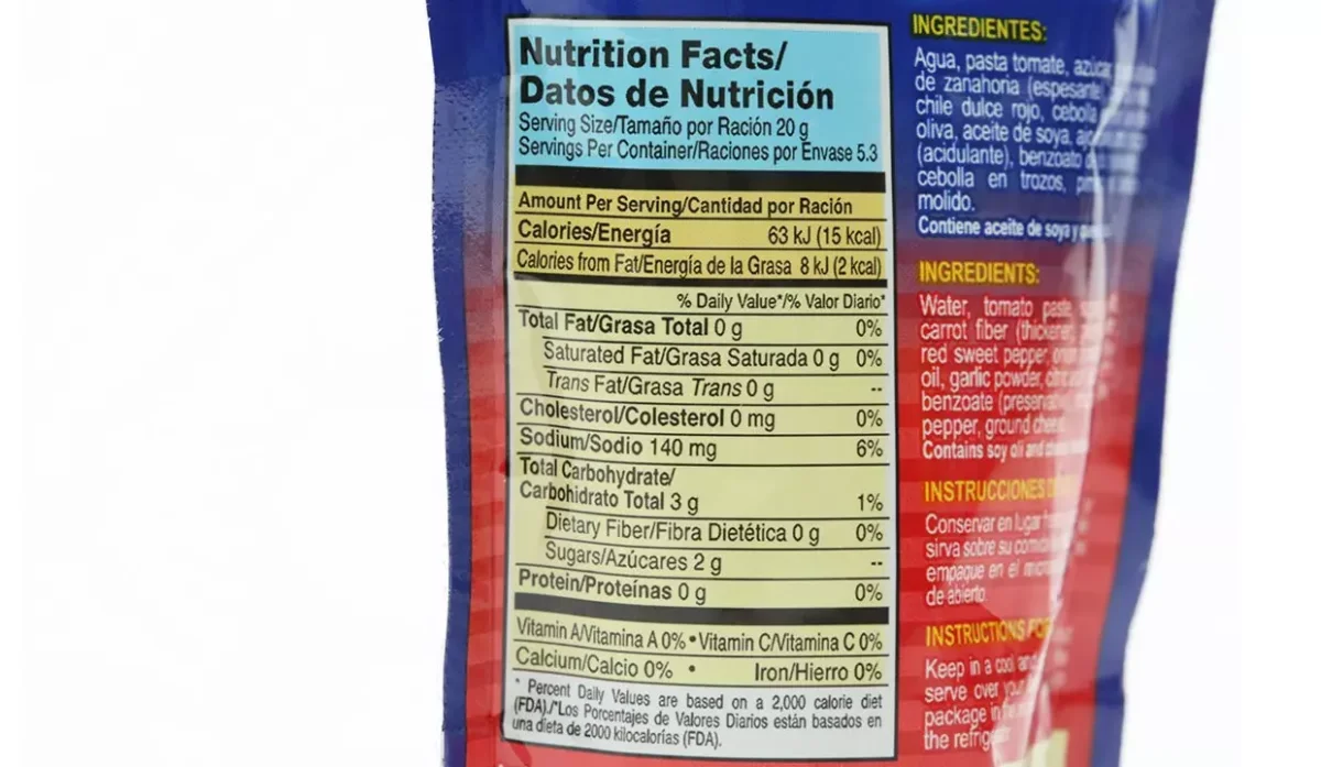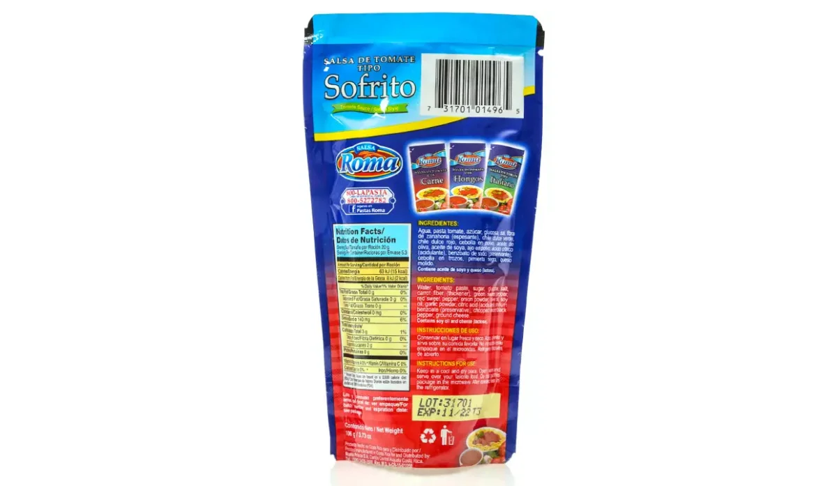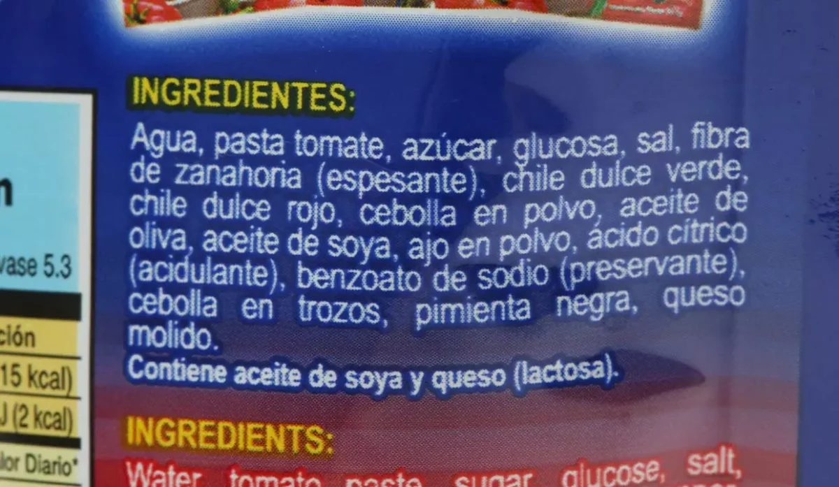 | Ingredientes | Agua, pasta de tomate, azúcar, fibra de zanahora, chile dulce verde y rojo, cebolla en polvo, aceite de oliva, aceite de soya, ajo en polvo, ácido cítrico, cebolla en trozos, pimienta negra y queso molido |