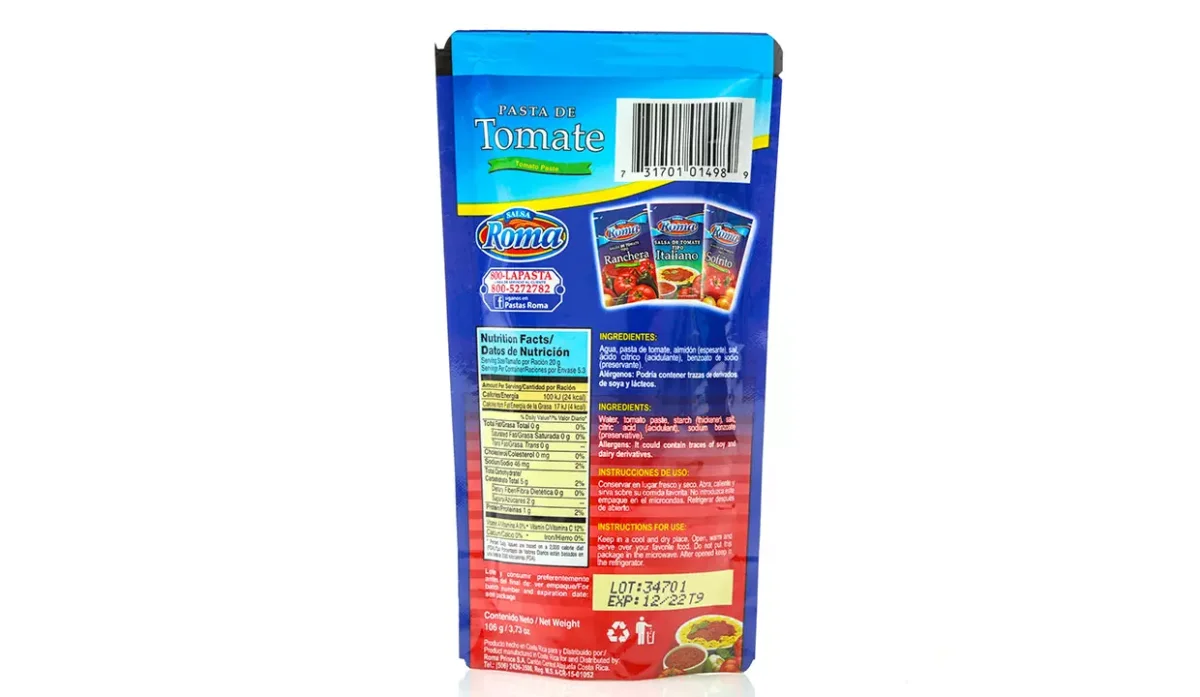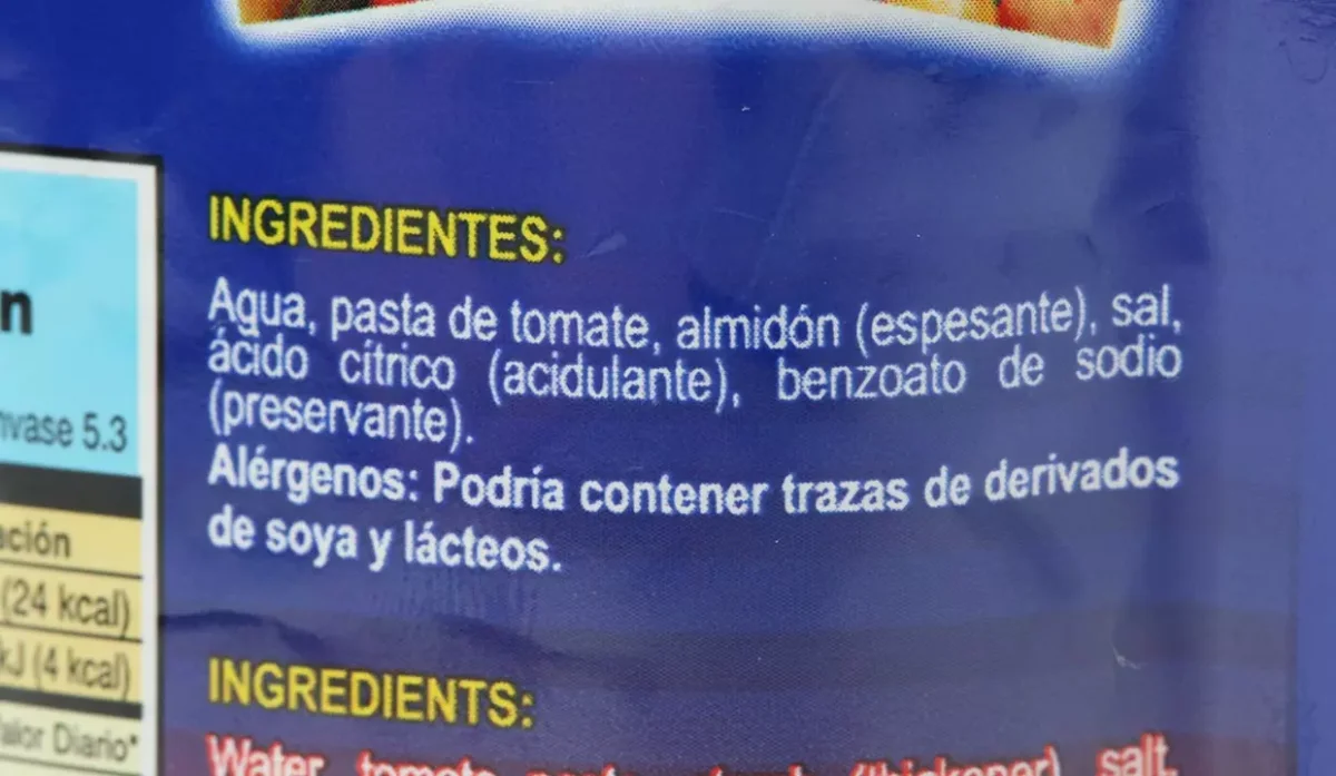 | Ingredientes | Agua, pasta de tomate, almidón y ácido cítrico |