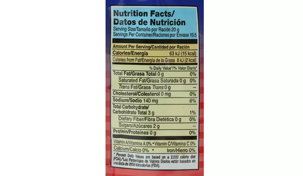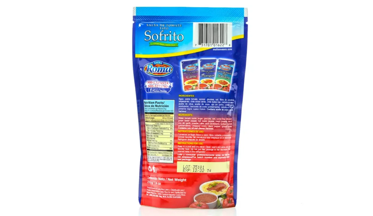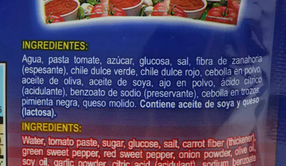 | Ingredientes | Agua, pasta de tomate, azúcar, fibra de zanahora, chile dulce verde y rojo, cebolla en polvo, aceite de oliva, aceite de soya, ajo en polvo, ácido cítrico, cebolla en trozos, pimienta negra y queso molido |