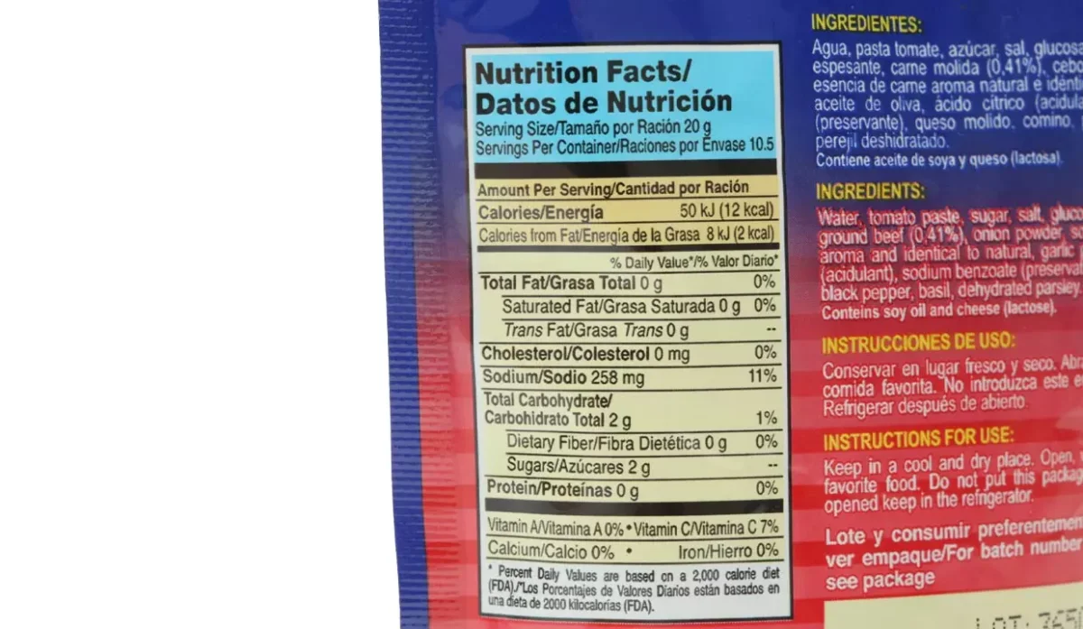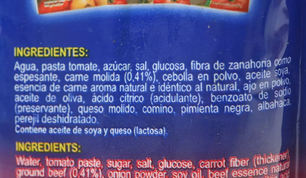 | Ingredientes | Agua, pasta de tomate, azúcar, sal, fibra de zanahoria, carne molida, cebolla en polvo, aceite de soya, ajo en polvo, aceite de oliva, queso molido, comino, pimienta negra, albahaca y perejil |